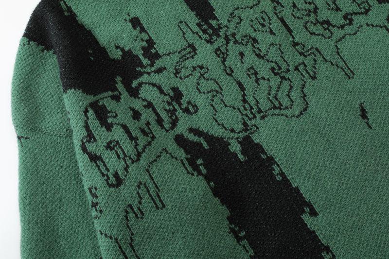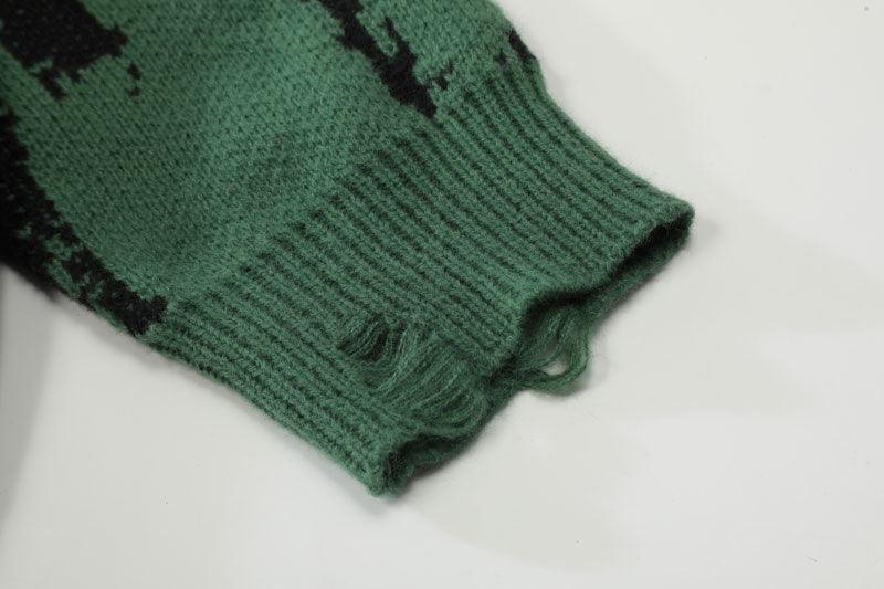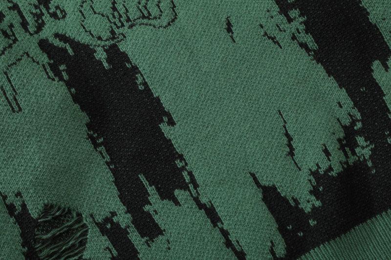 Distressed cotton knit sweater, breathable, dense yet light, knit graphic on front, ribbed cuffs/hem/collar.
