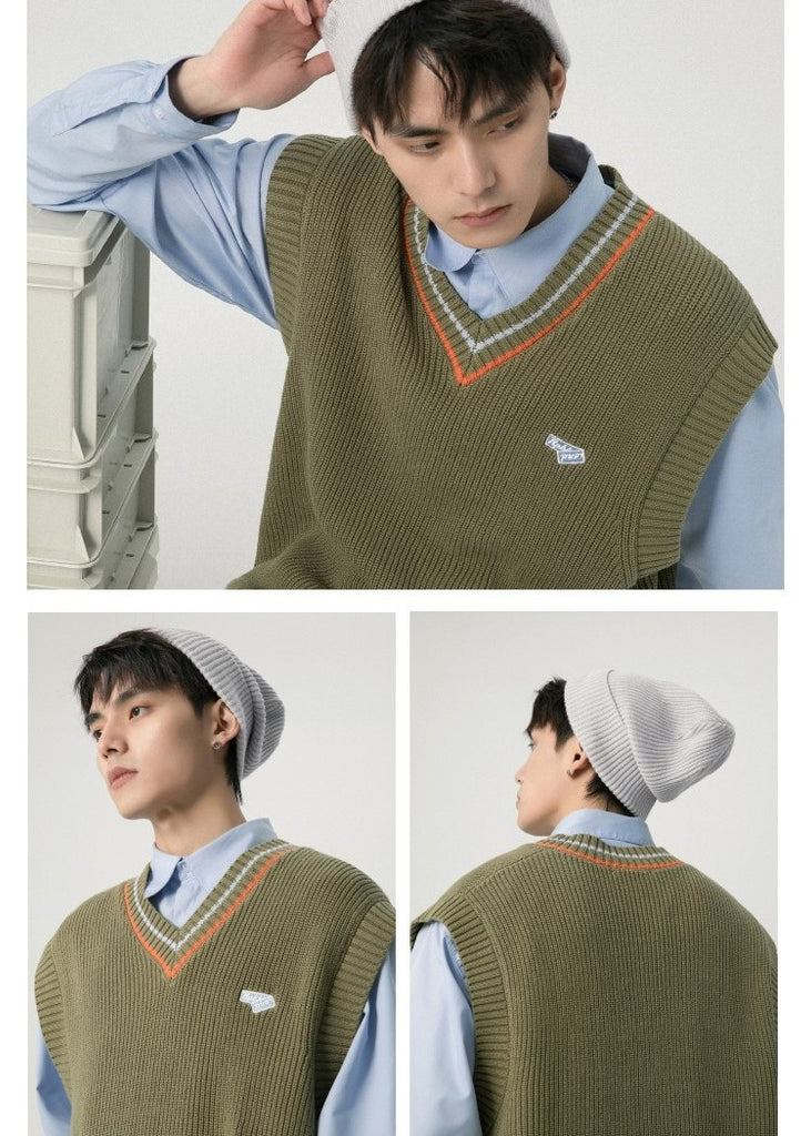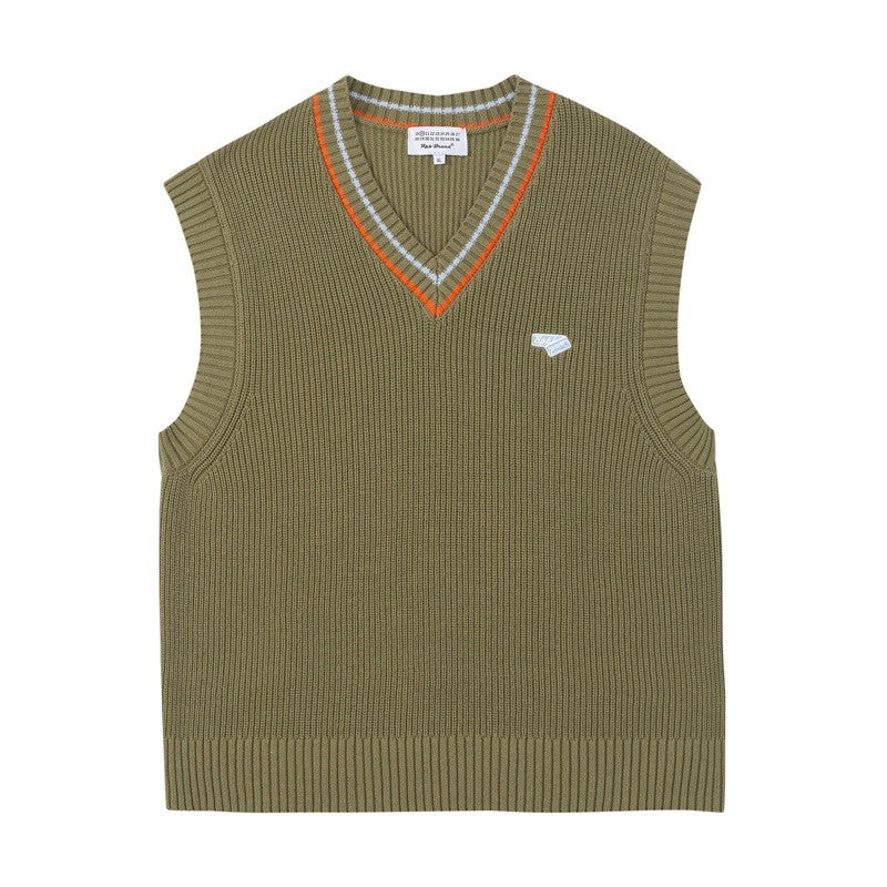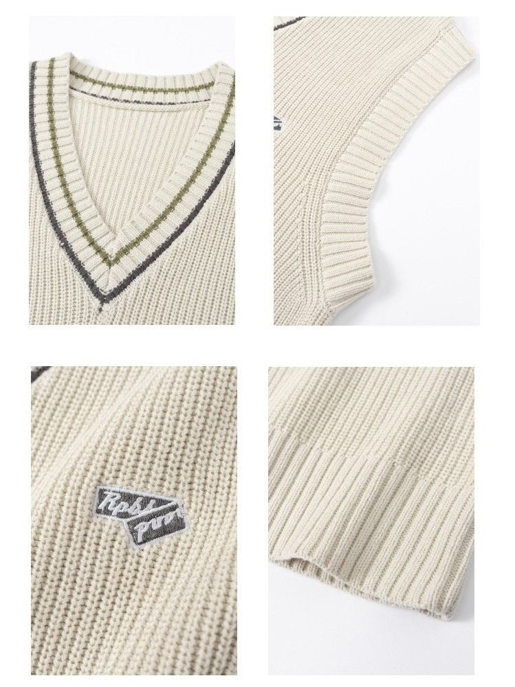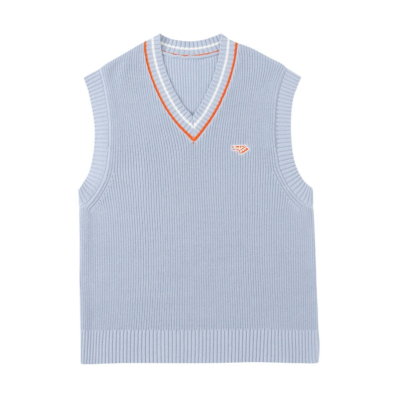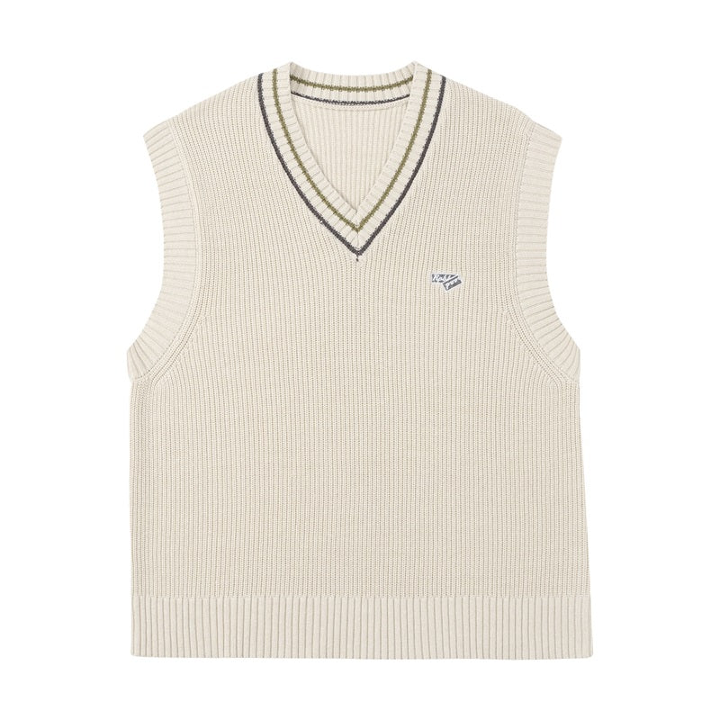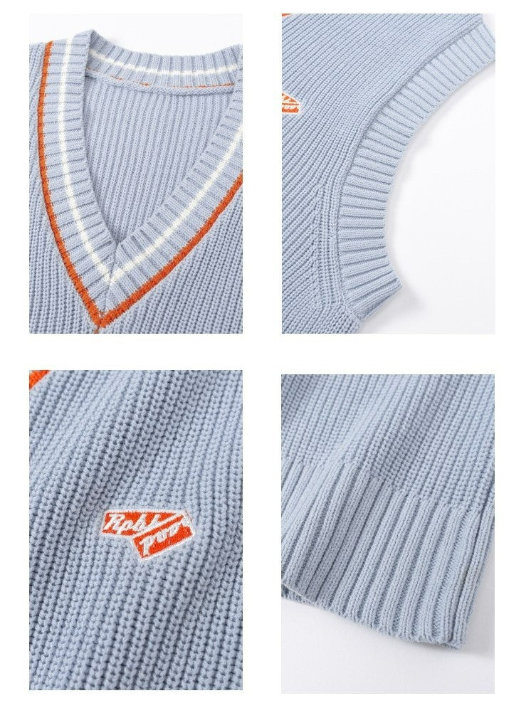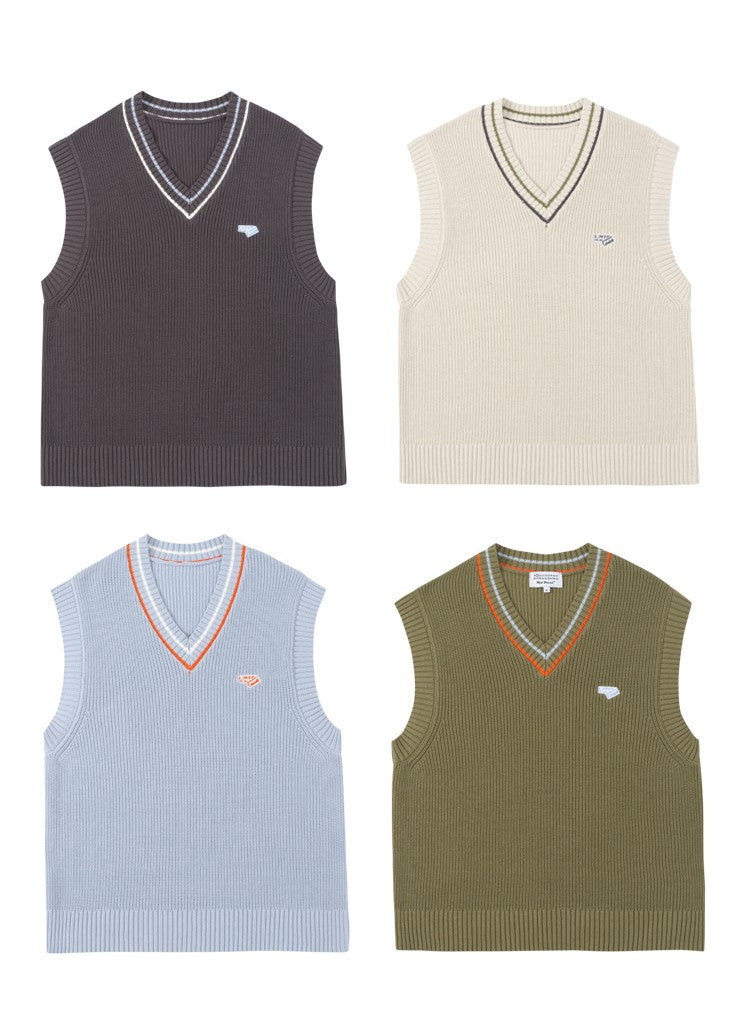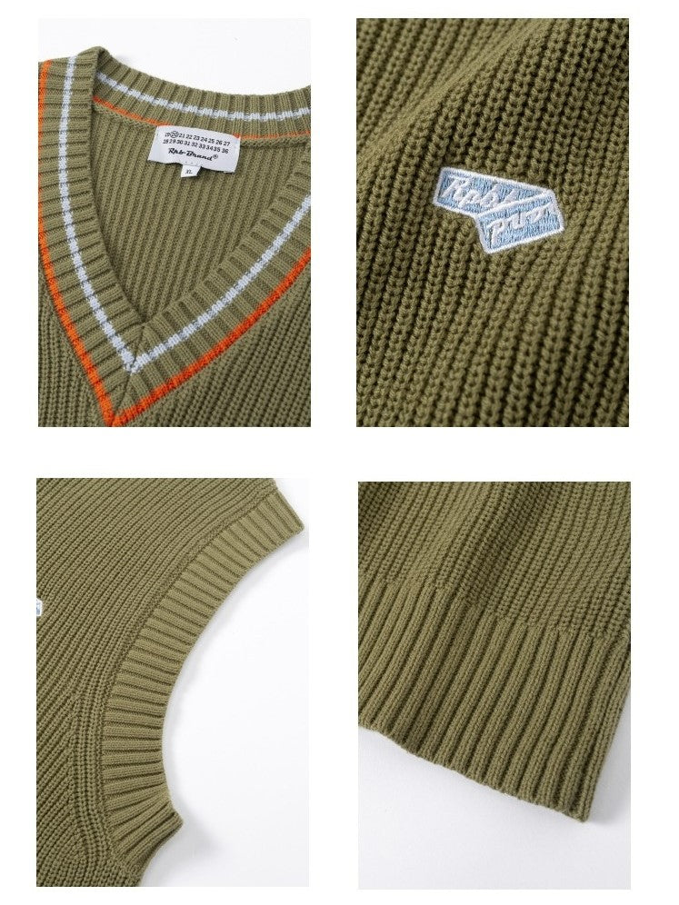 RPB cotton vest, ribbed knit V-neck, armscyes & hem, design patched at front, double stripe batten at V-neck.