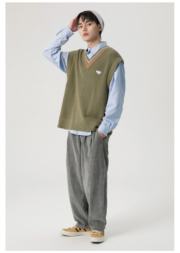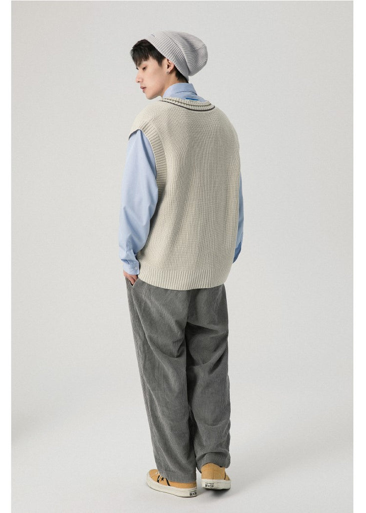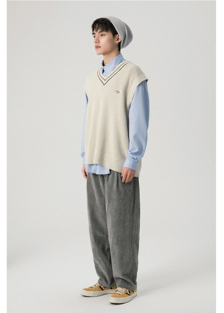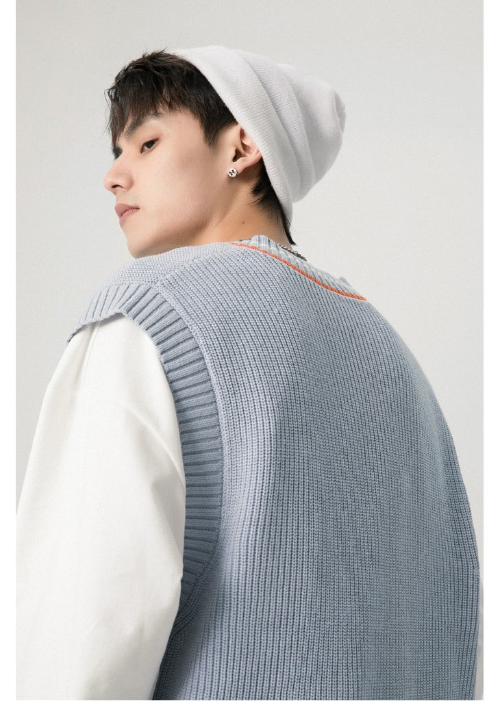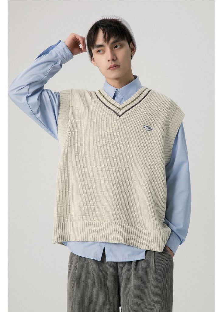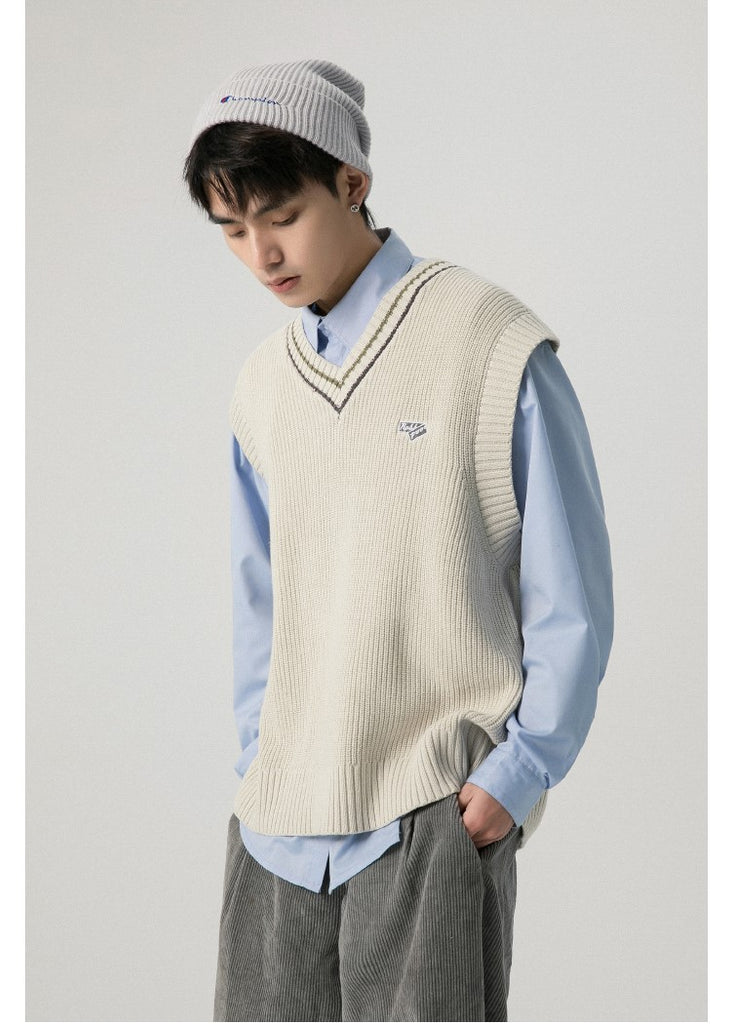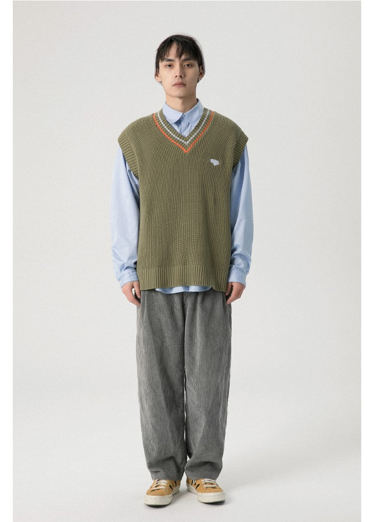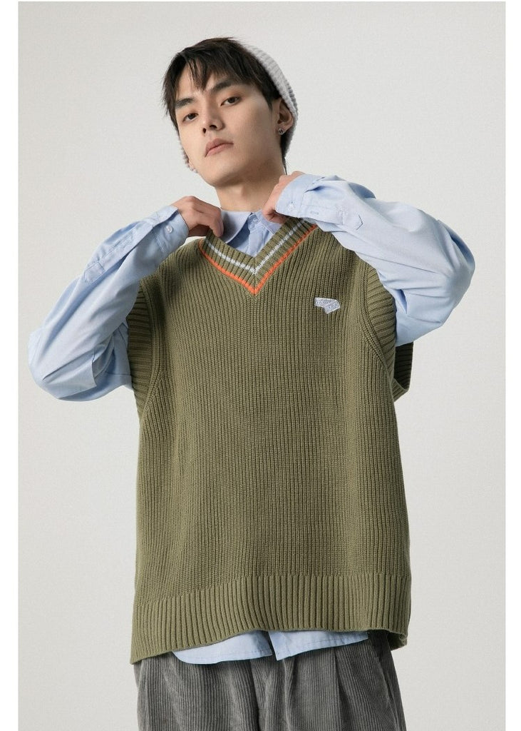 RPB cotton vest, ribbed knit V-neck, armscyes & hem, design patched at front, double stripe batten at V-neck.