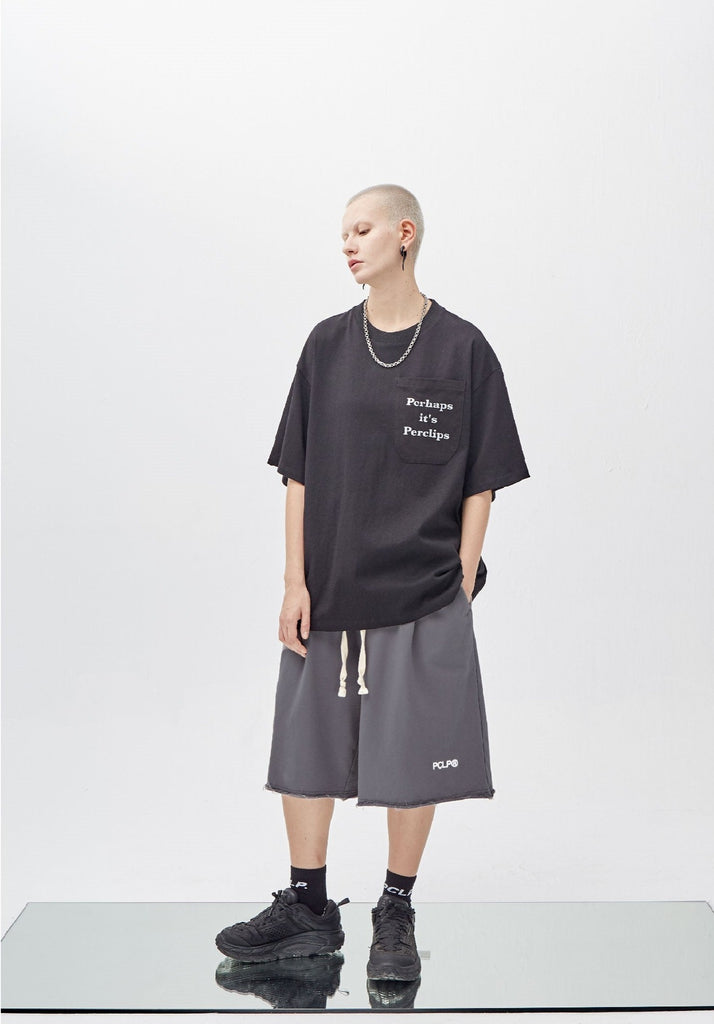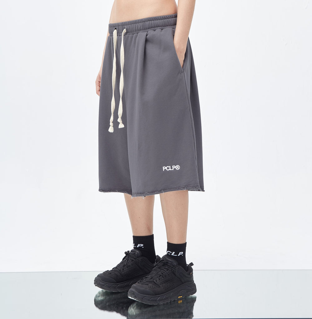 PCLP cotton shorts, drawstring fastening at elasticized waistband, two-pocket styling, raw edge at hem, logo sewn at front.