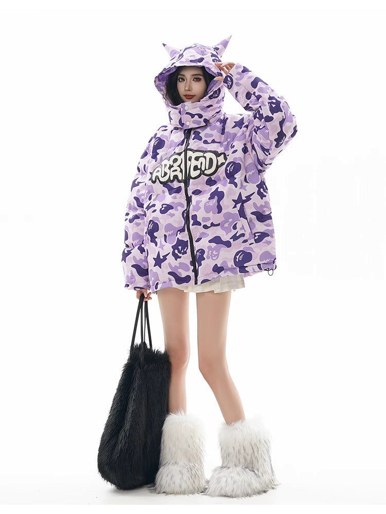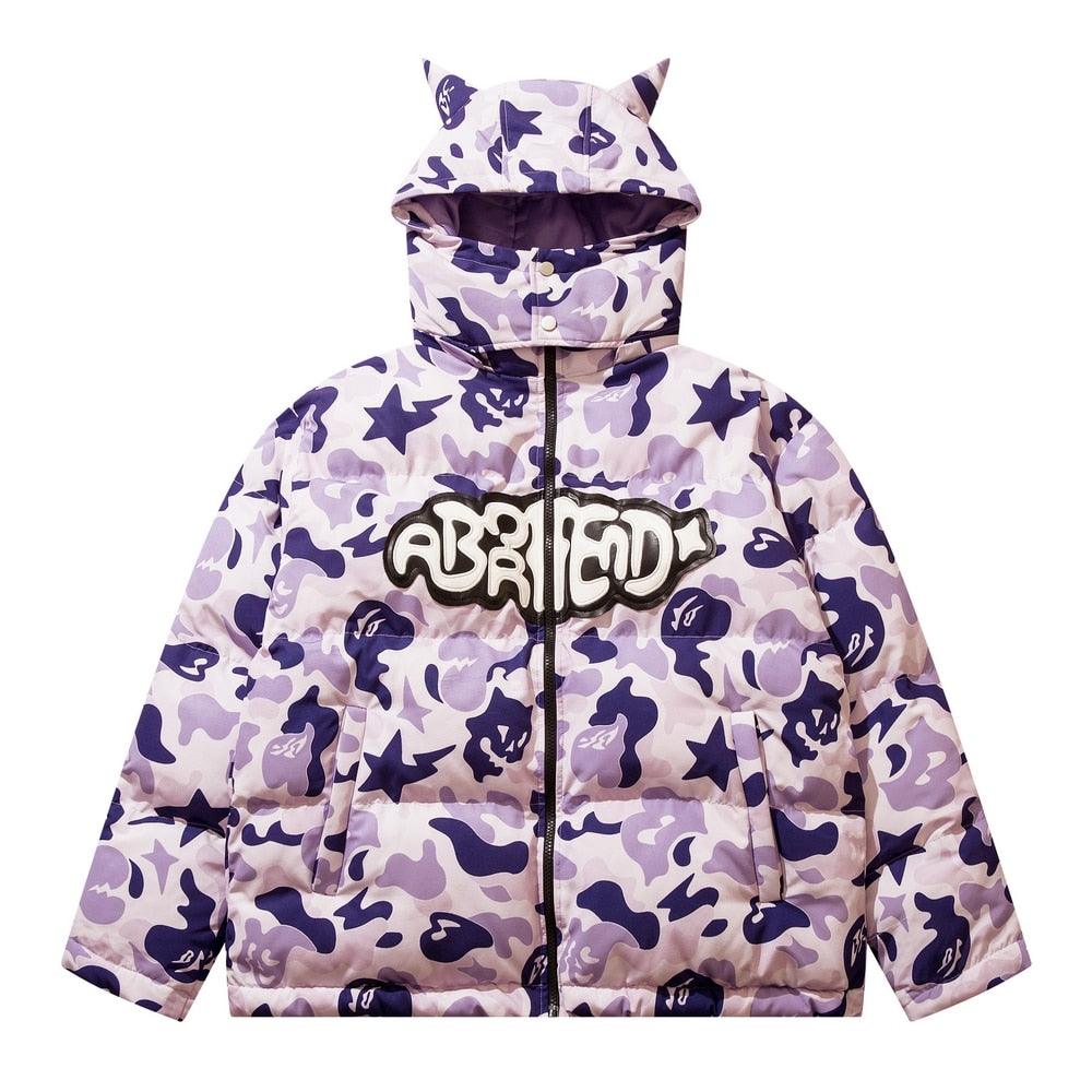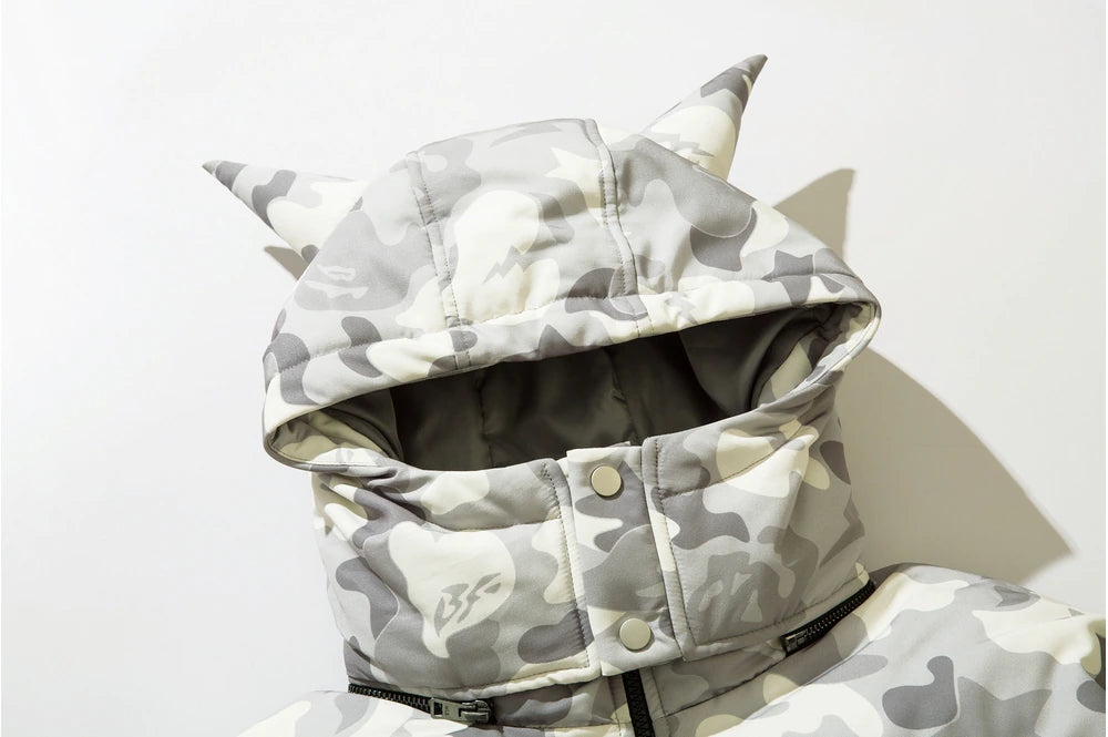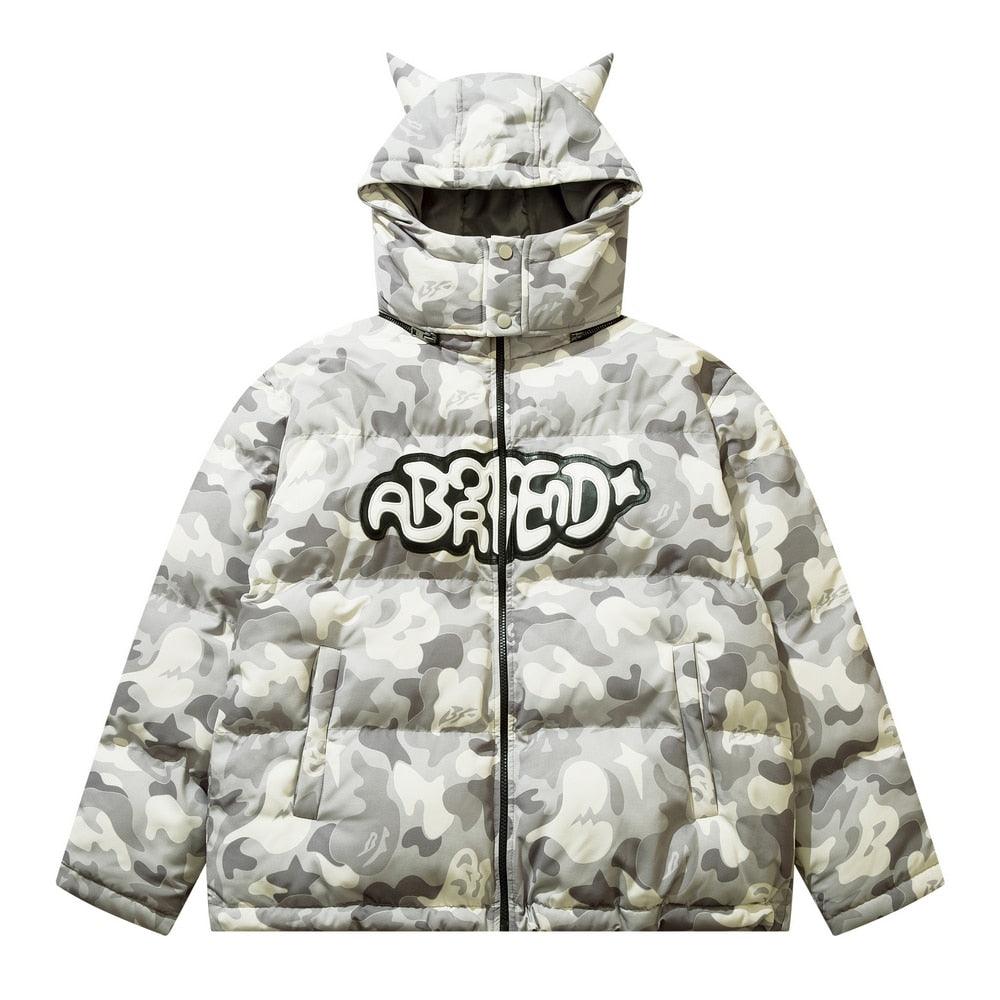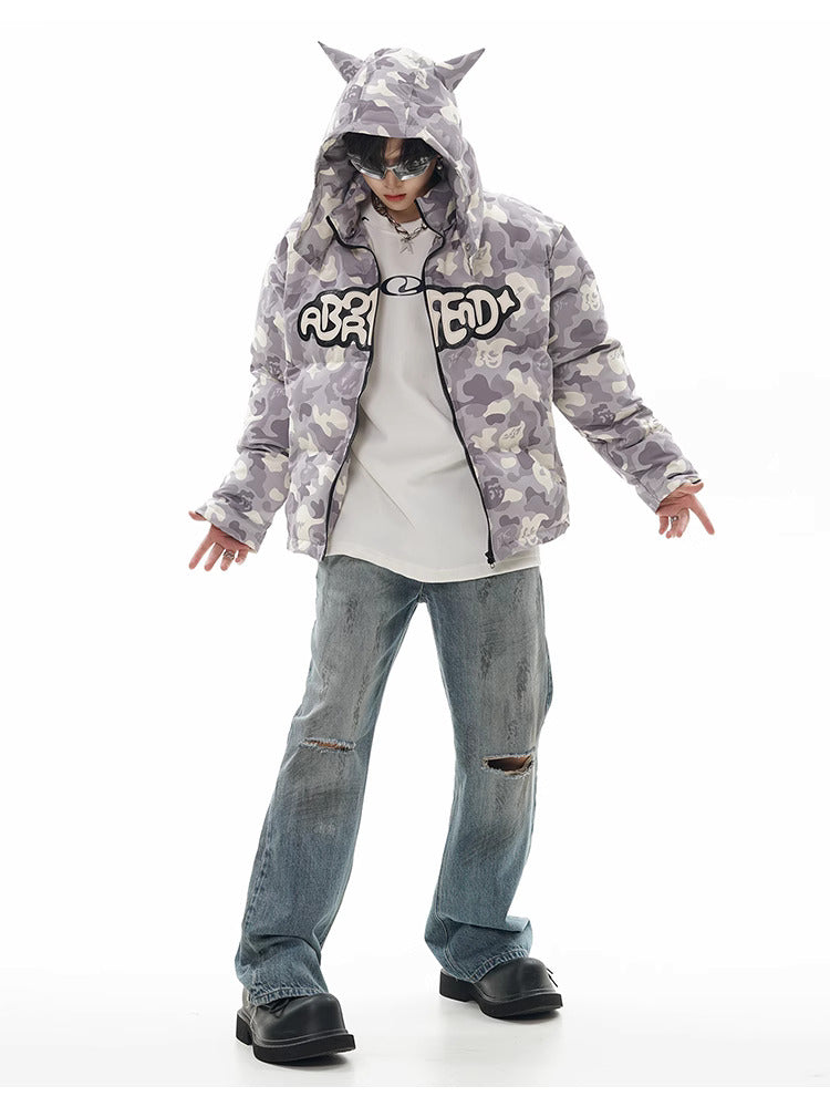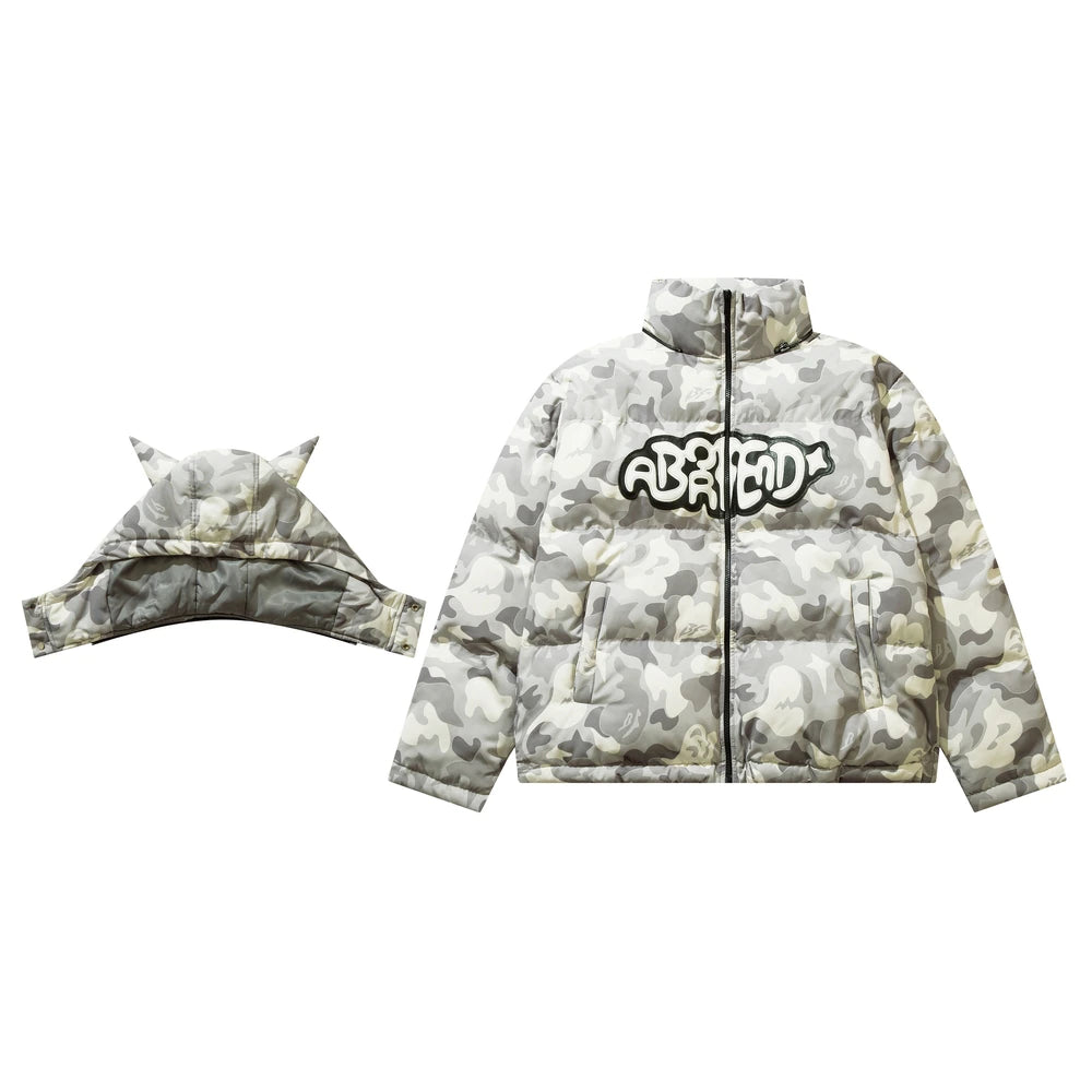 Insulated puffer jacket, horn appliques at detachable hood with button closure, stand collar, zip closure, text patch at chest, welt pockets.