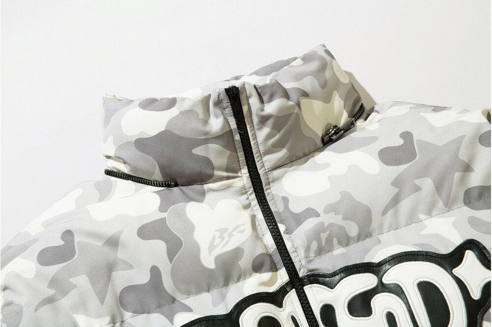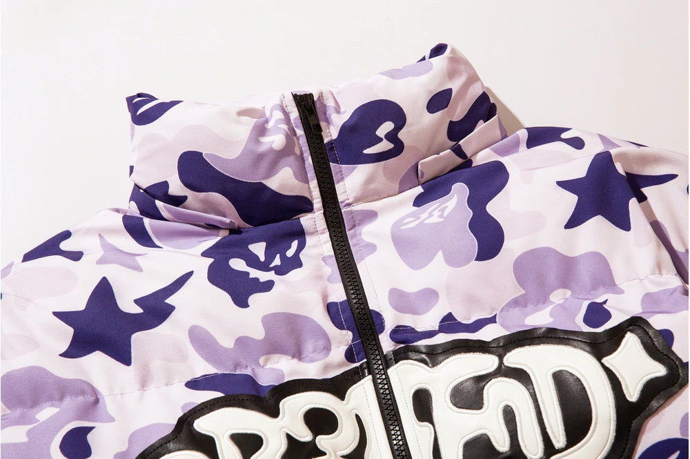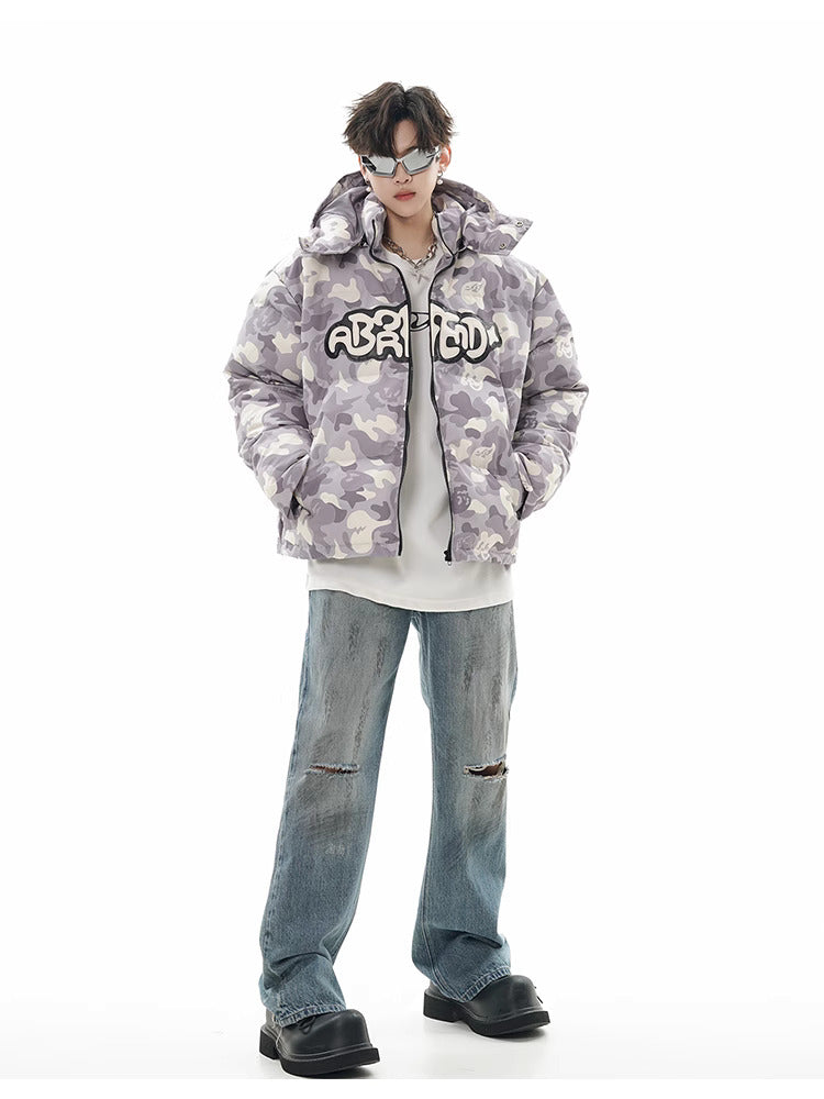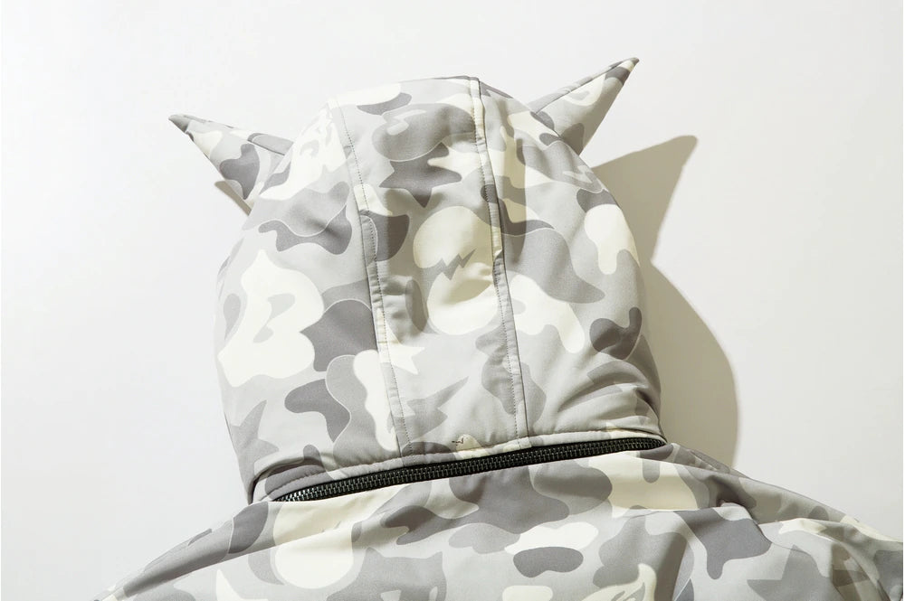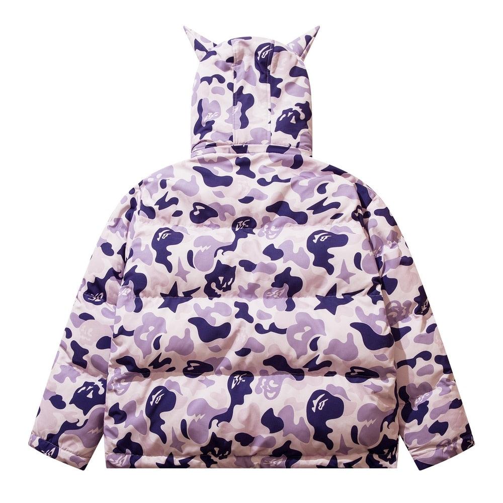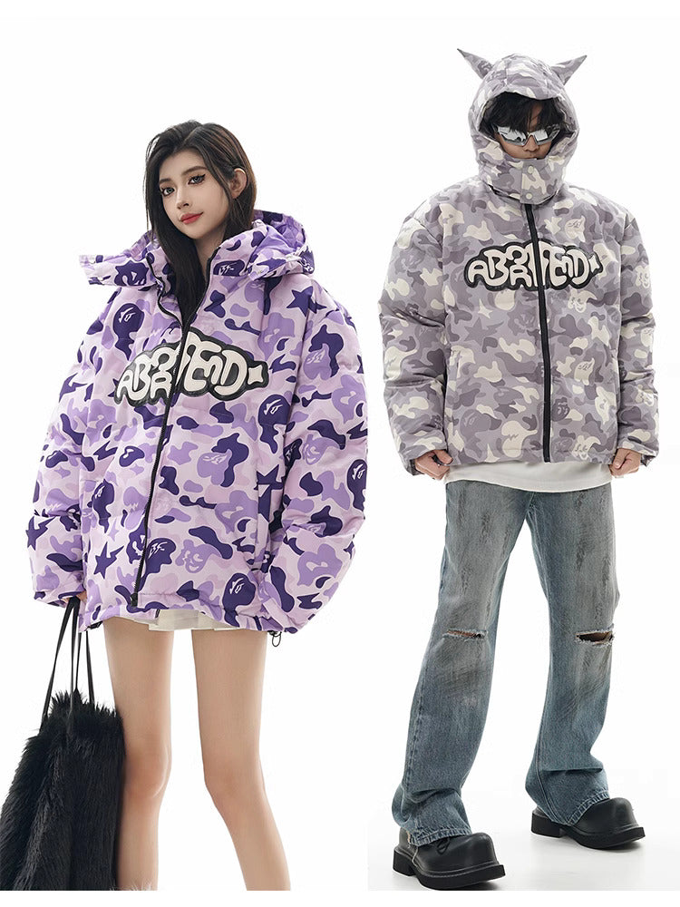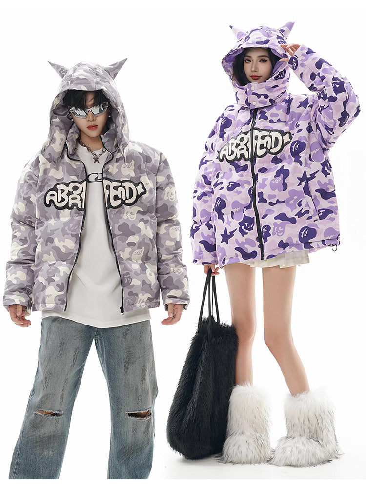 Insulated puffer jacket, horn appliques at detachable hood with button closure, stand collar, zip closure, text patch at chest, welt pockets.