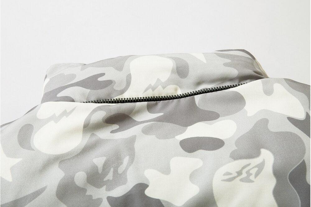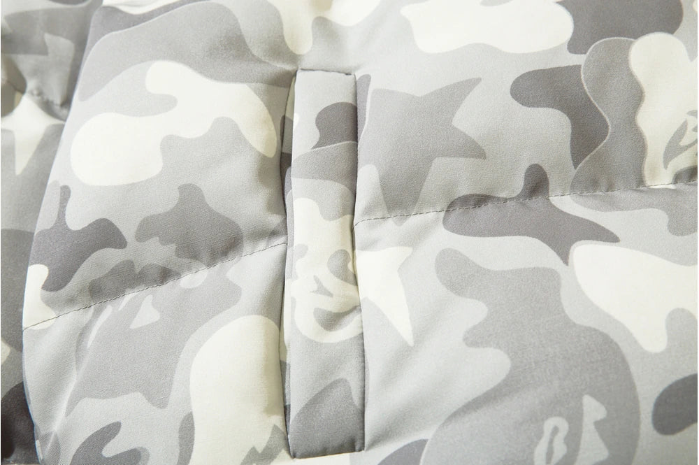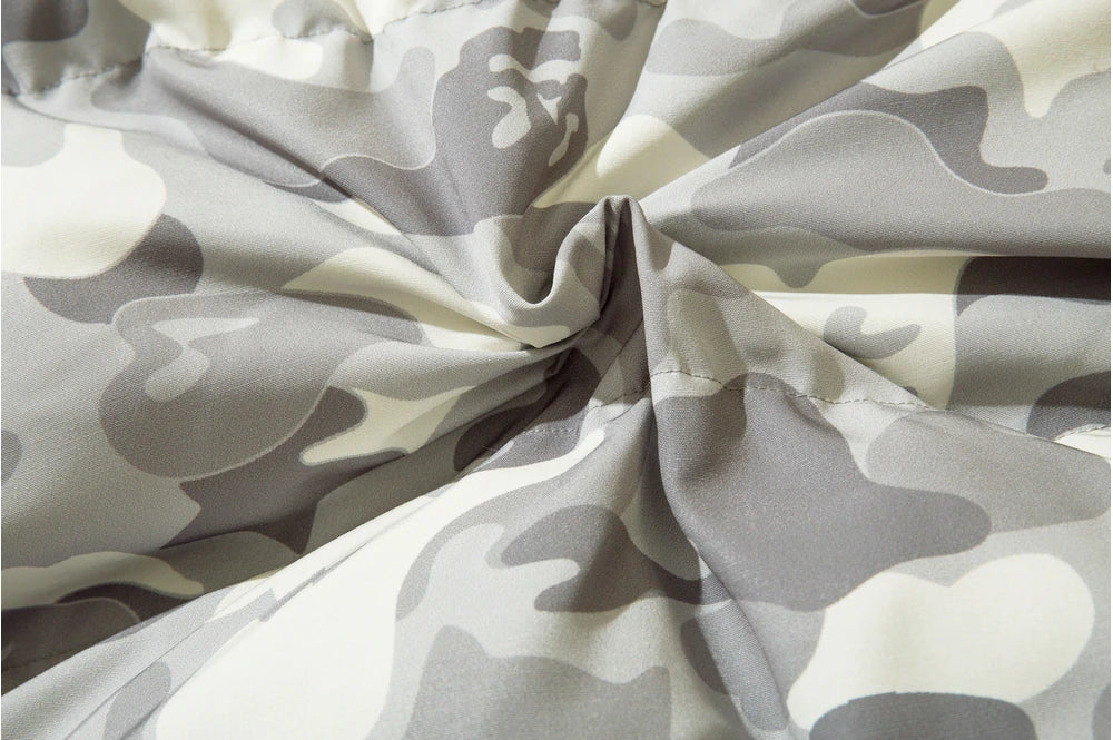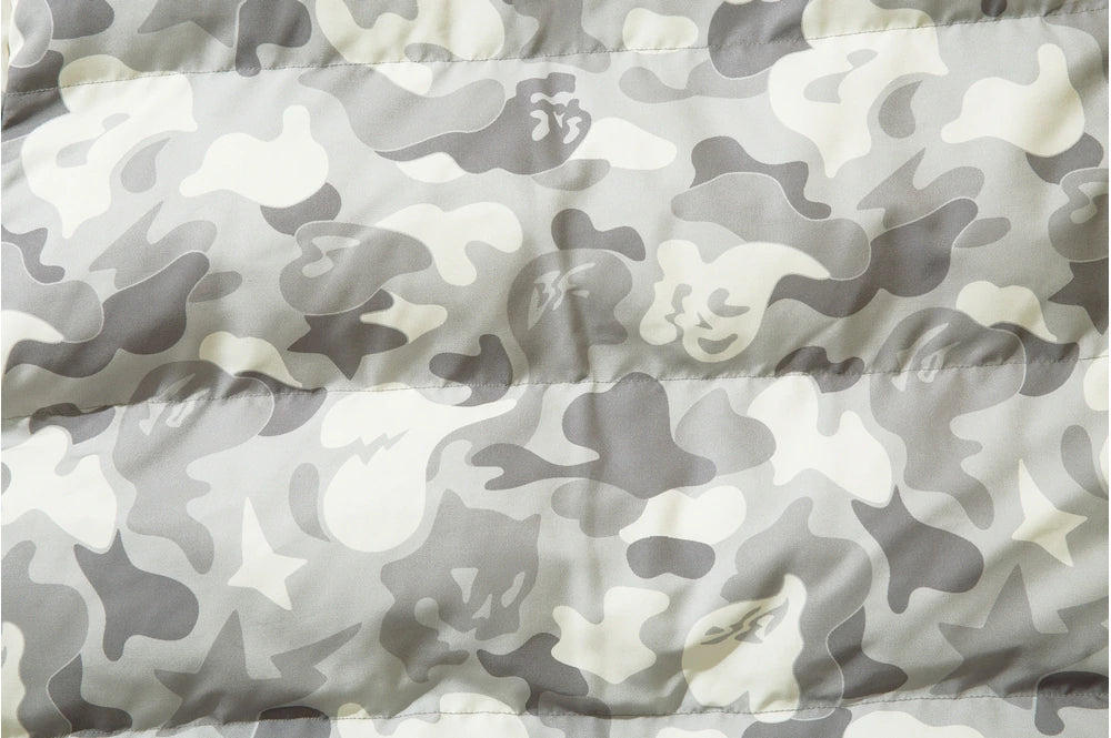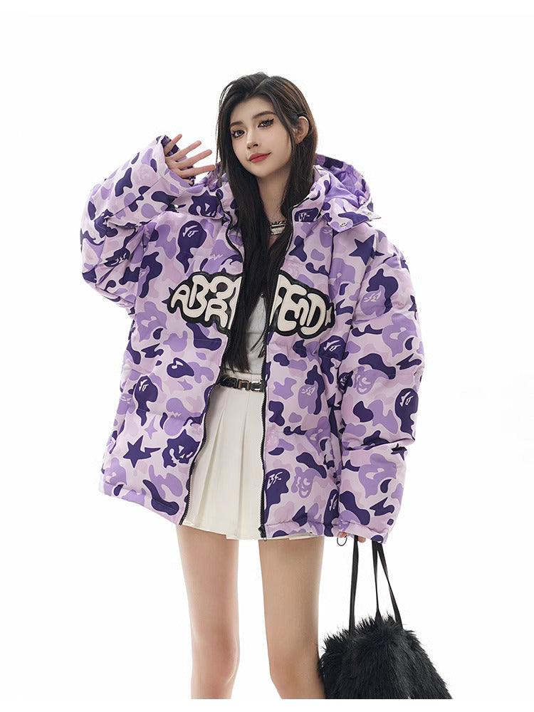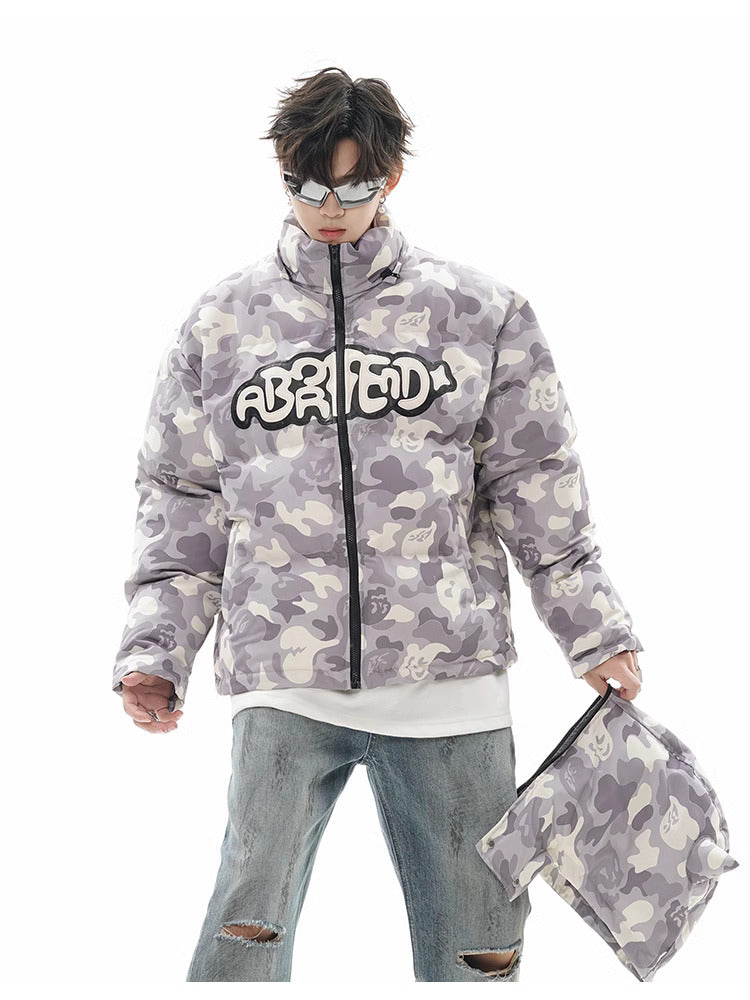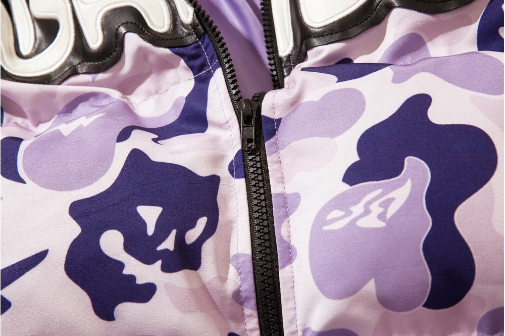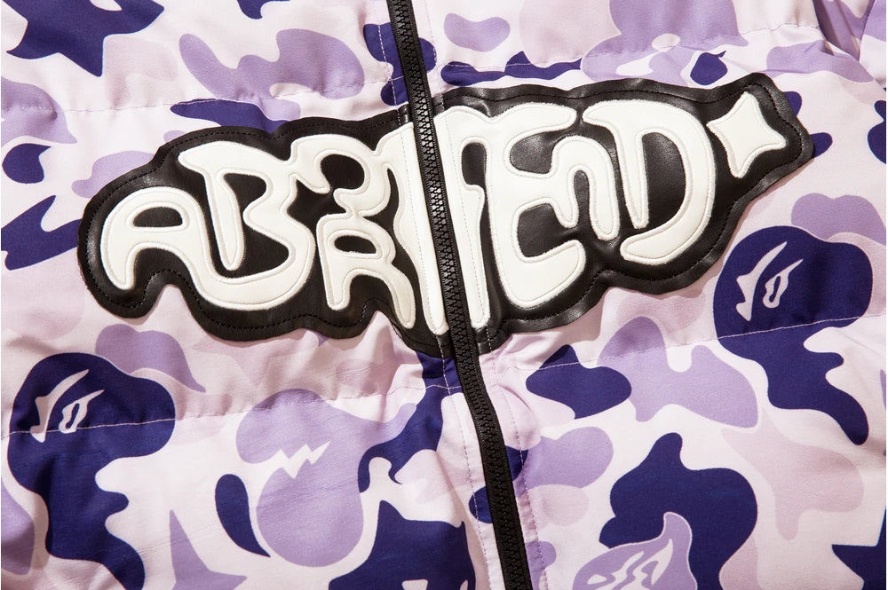 Insulated puffer jacket, horn appliques at detachable hood with button closure, stand collar, zip closure, text patch at chest, welt pockets.