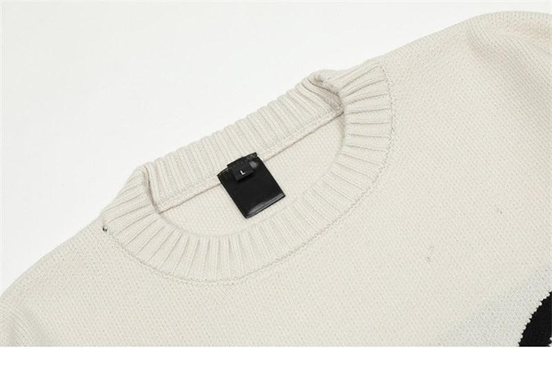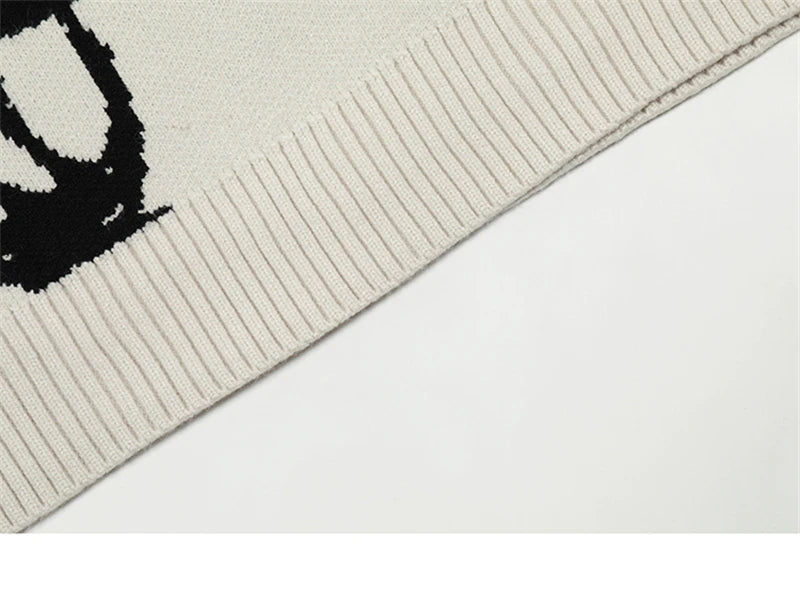 Cotton knit sweater, breathable, dense yet light, knit graphic on front, ribbed cuffs/hem/collar.