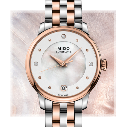 Material:Stainless steel with rose gold PVD coatingDiameter:33.00 mmBetween lugs:16.00 mmWater-resistance:5 bar (50 m / 165 ft)Crystal:Sapphire crystal with double sided anti-reflection treatmentCase height:9.89 mmTransparent casebackDial set with 3 diamonds (0.051 ct)Dial colour:White mother-of-pearlHour Markers:Diamonds