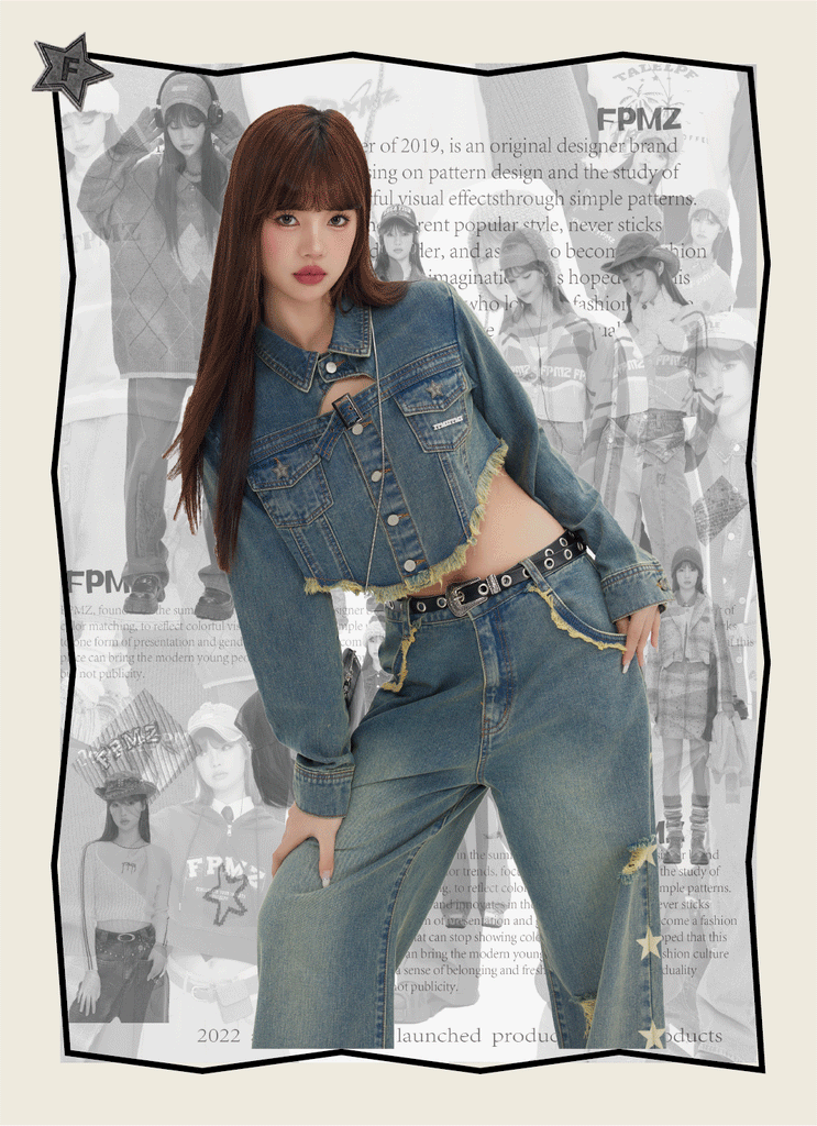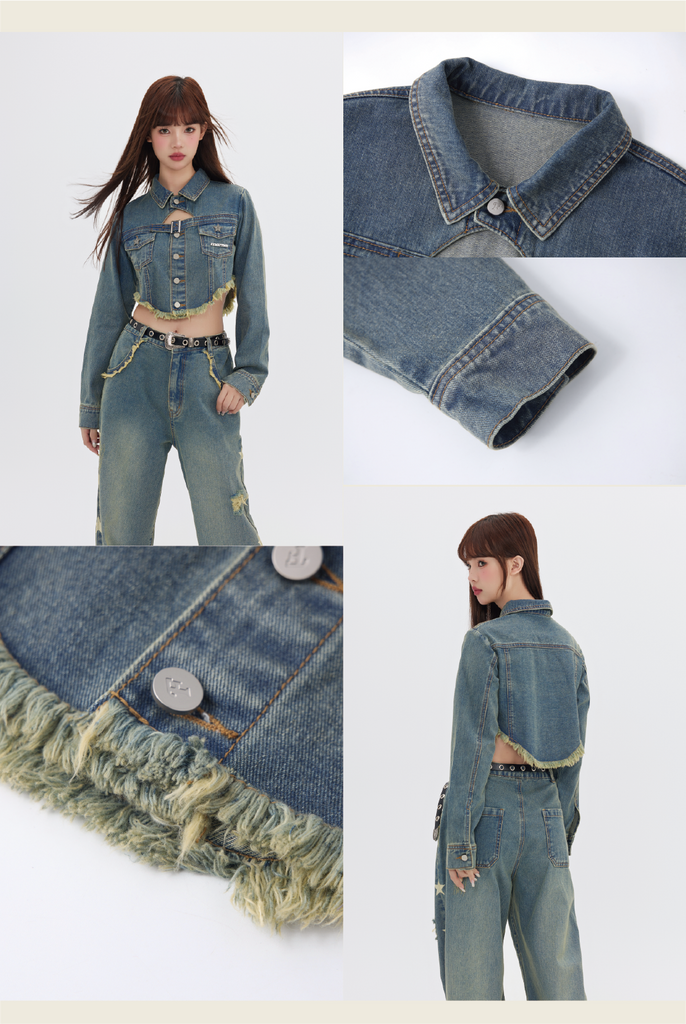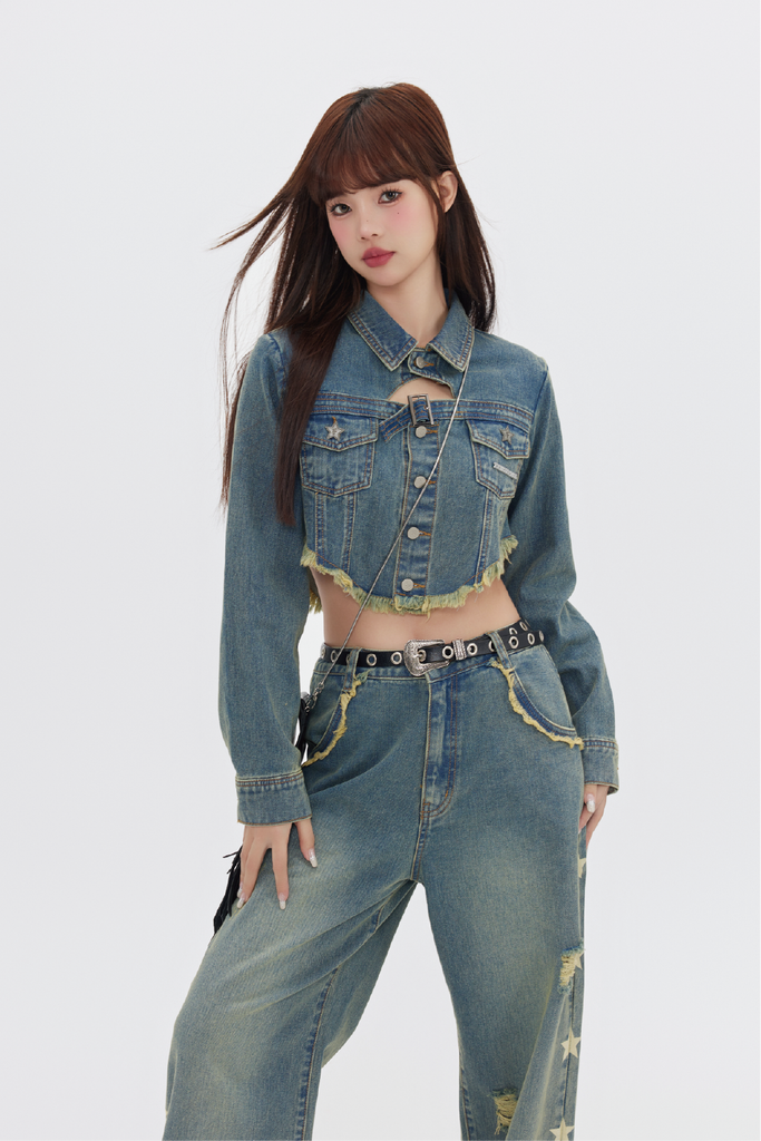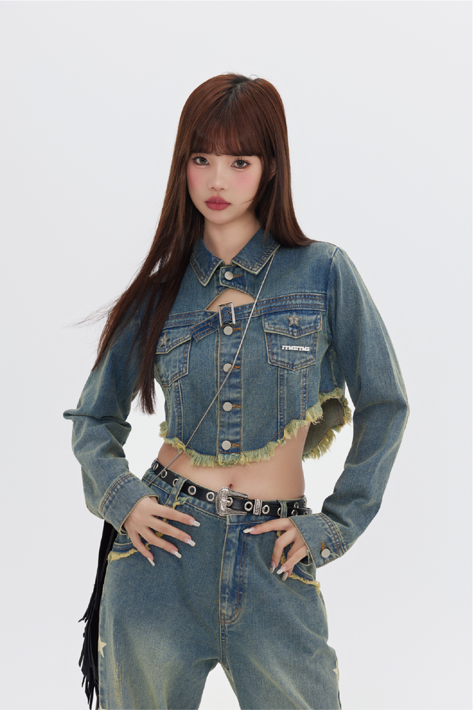 FPMZ non-stretch denim jacket, fading throughout, spread collar, flap pockets, belt buckle at chest, button closure, fringed detailing at hem, logo engraved silver-tone hardware, single-button barrel cuffs.