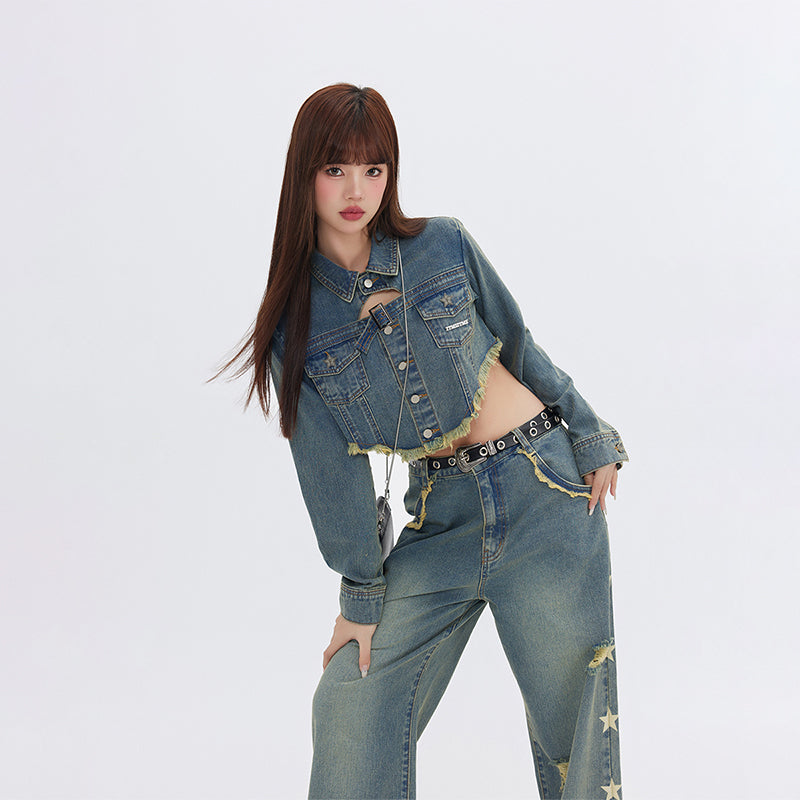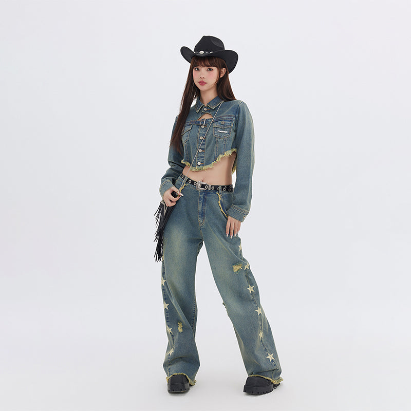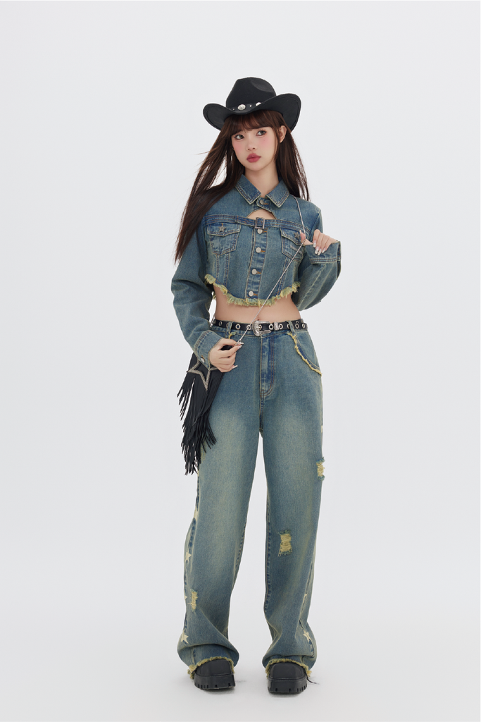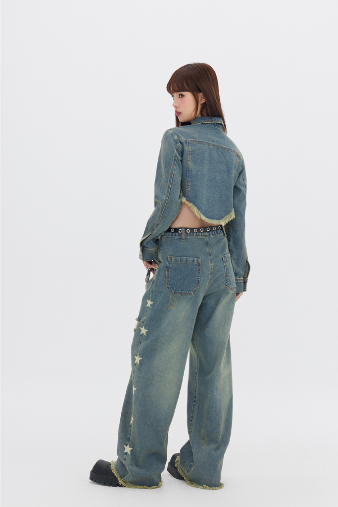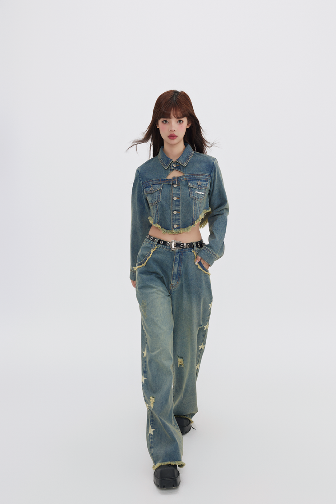 FPMZ non-stretch denim jacket, fading throughout, spread collar, flap pockets, belt buckle at chest, button closure, fringed detailing at hem, logo engraved silver-tone hardware, single-button barrel cuffs.