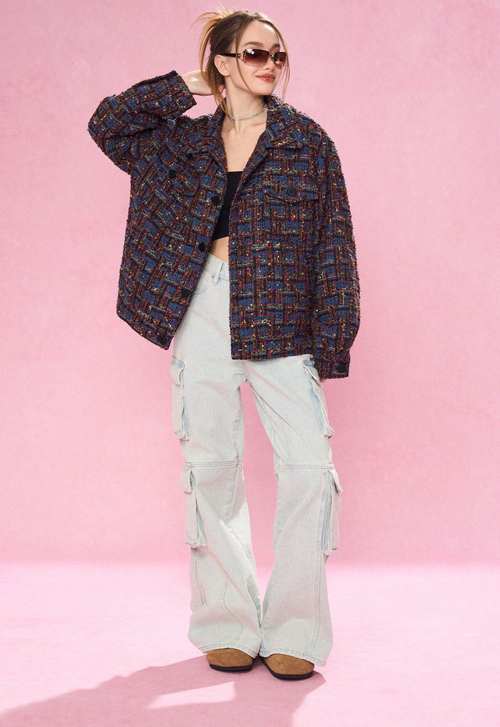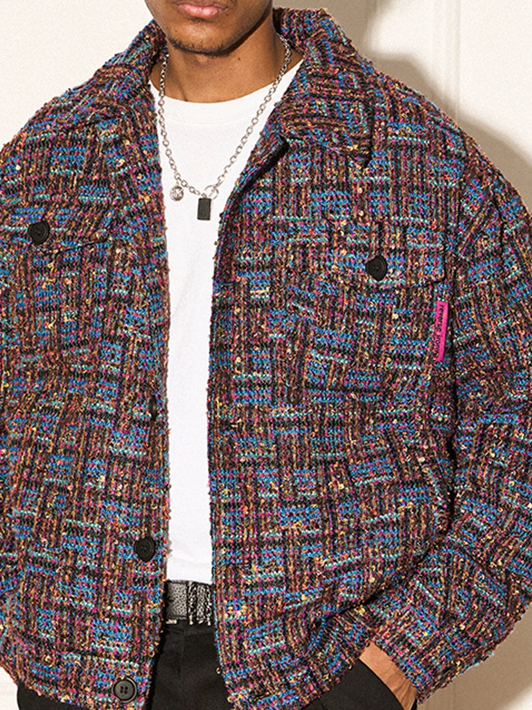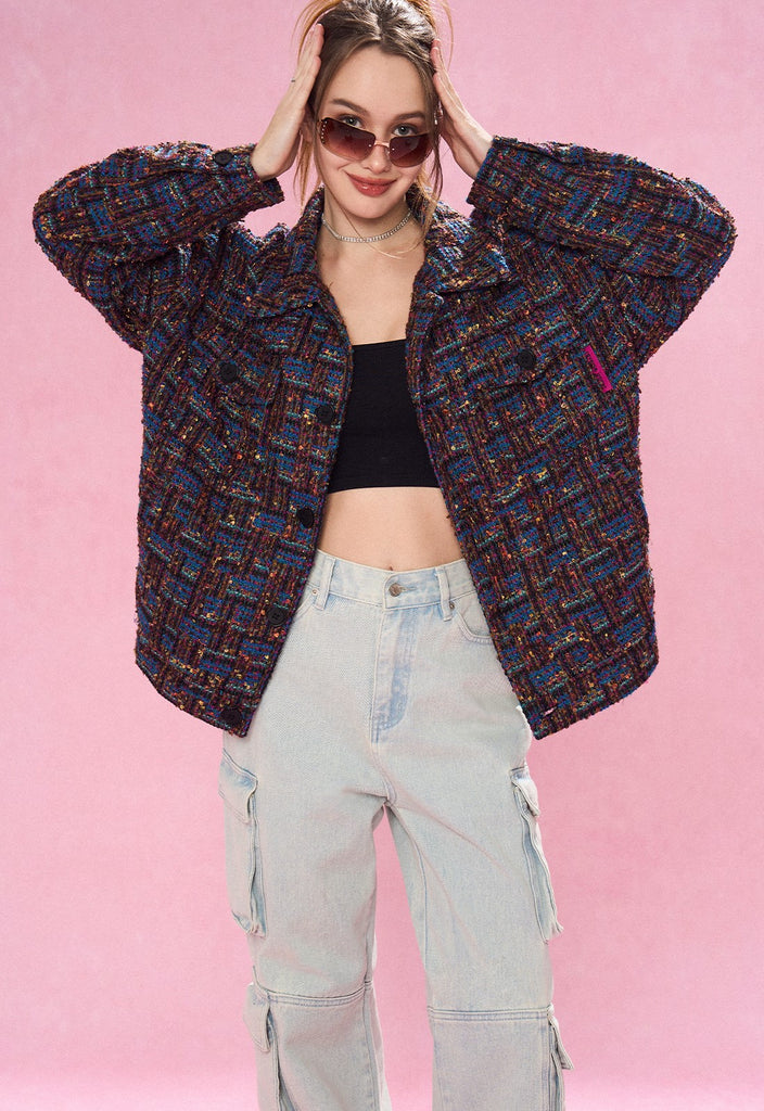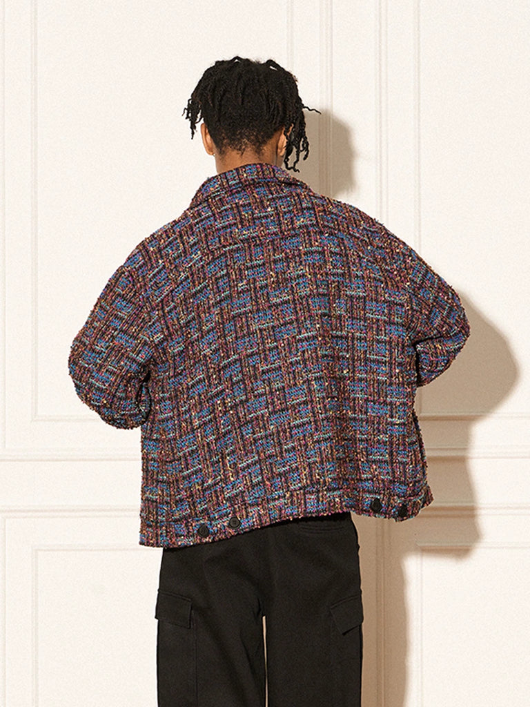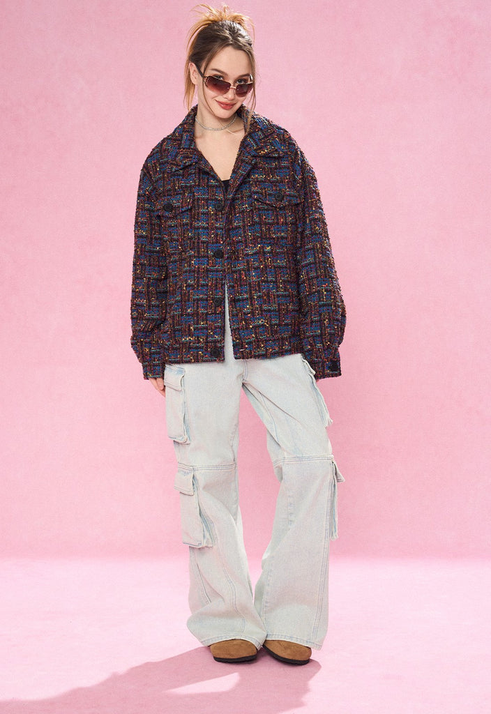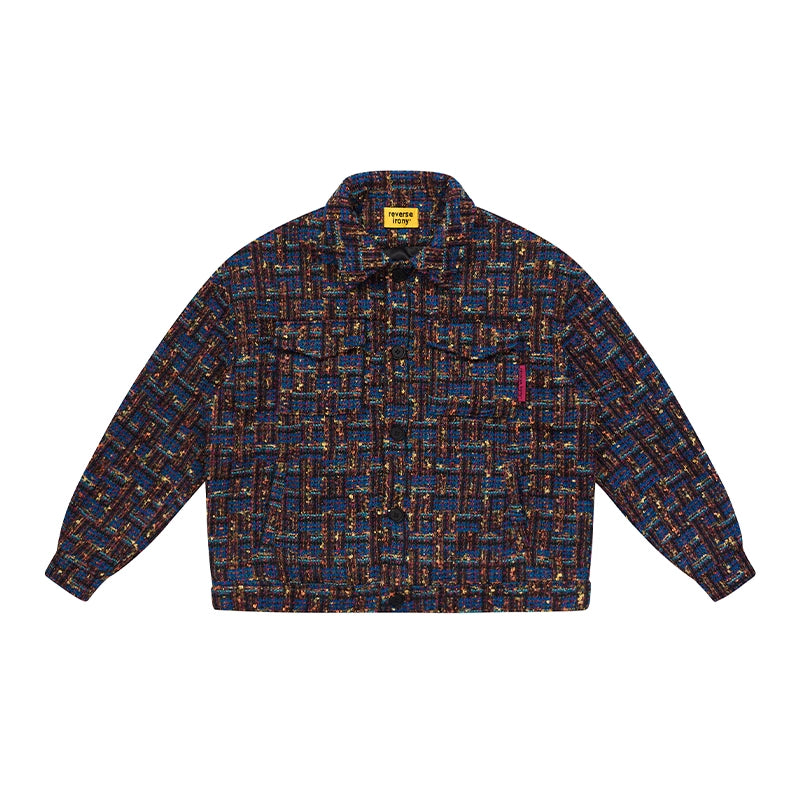 REVERSE IRONY tweed jacket, jacquard check pattern throughout, spread collar, dropped shoulders, button closure, patch pockets at front.
