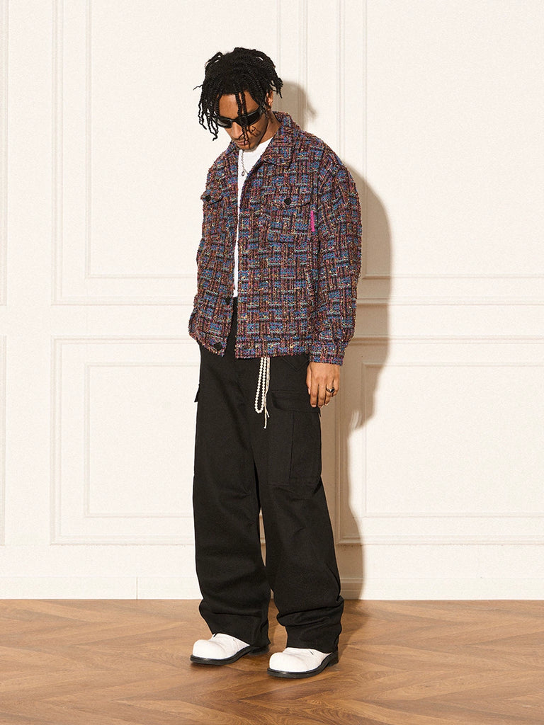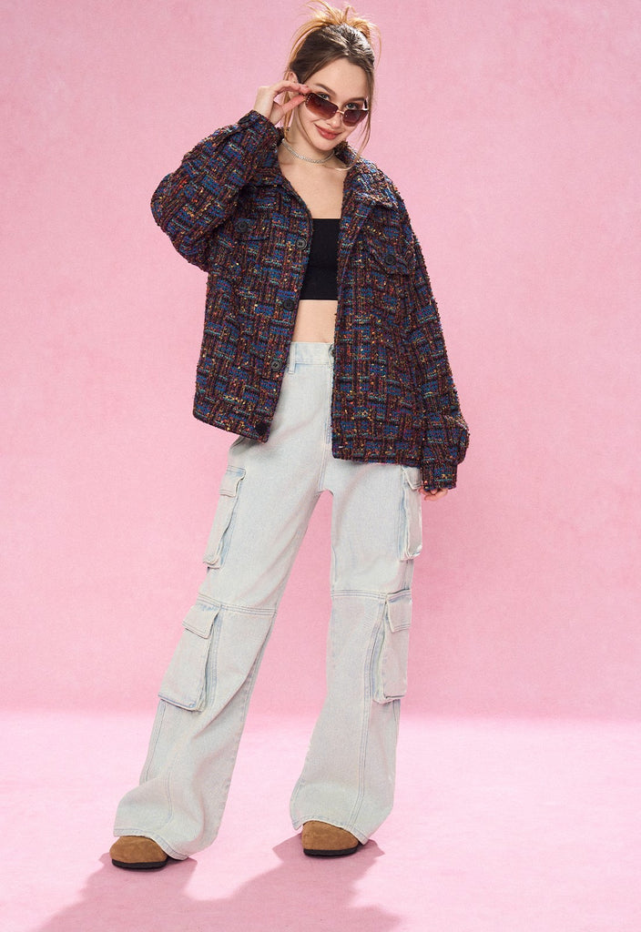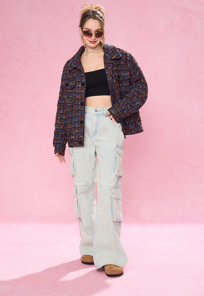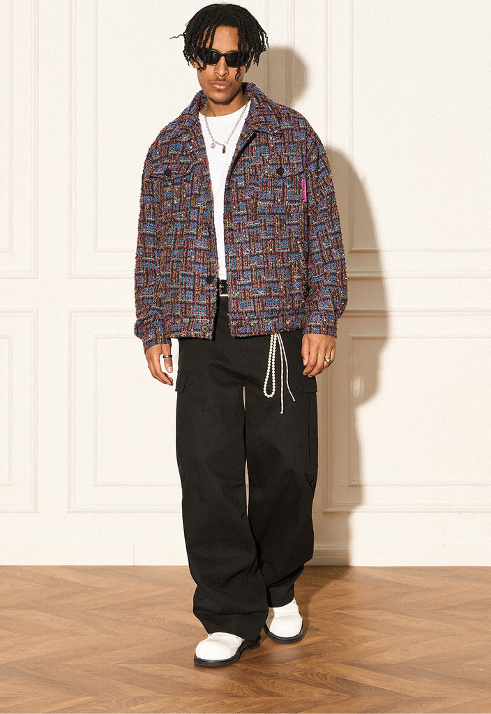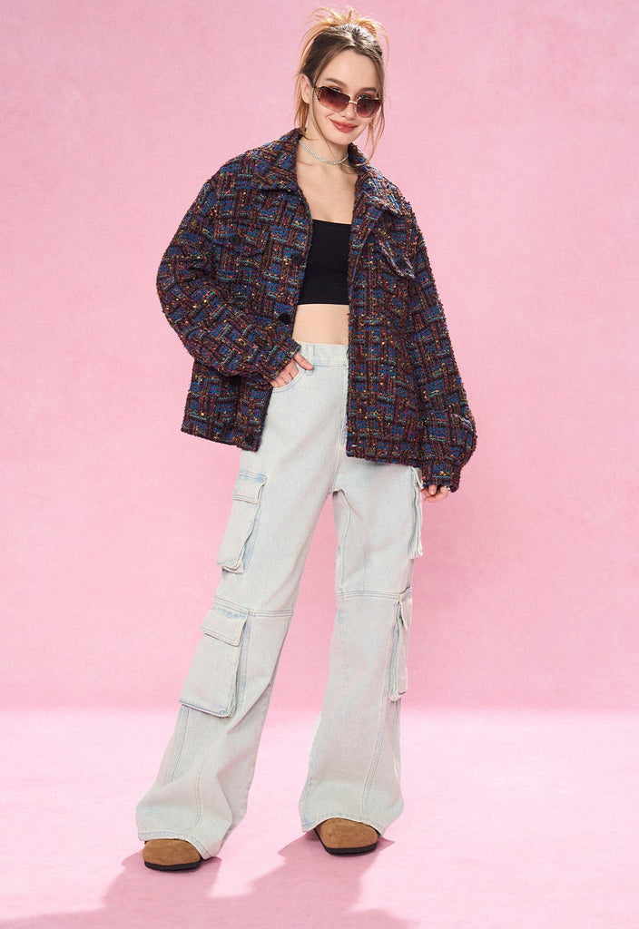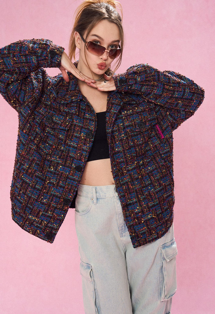 REVERSE IRONY tweed jacket, jacquard check pattern throughout, spread collar, dropped shoulders, button closure, patch pockets at front.