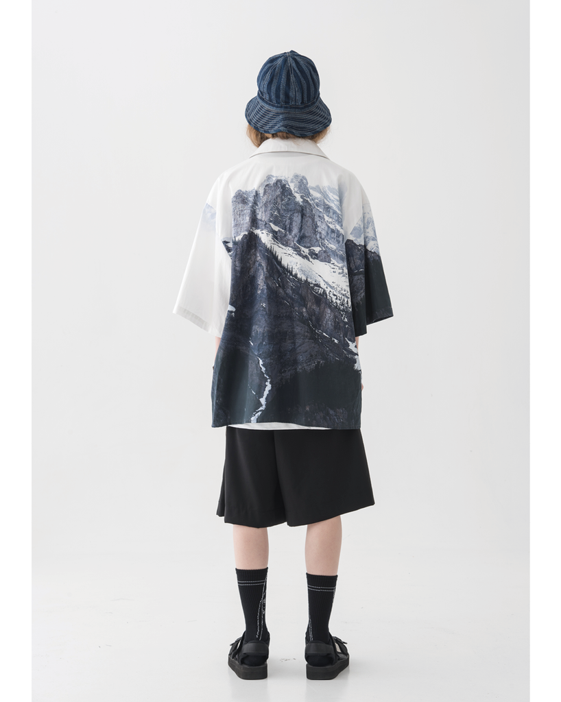 HARSH and CRUEL polyester short sleeve shirt, mountain graphic printed throughout, open spread collar, dropped shoulders, button closure, logo printed at chest.