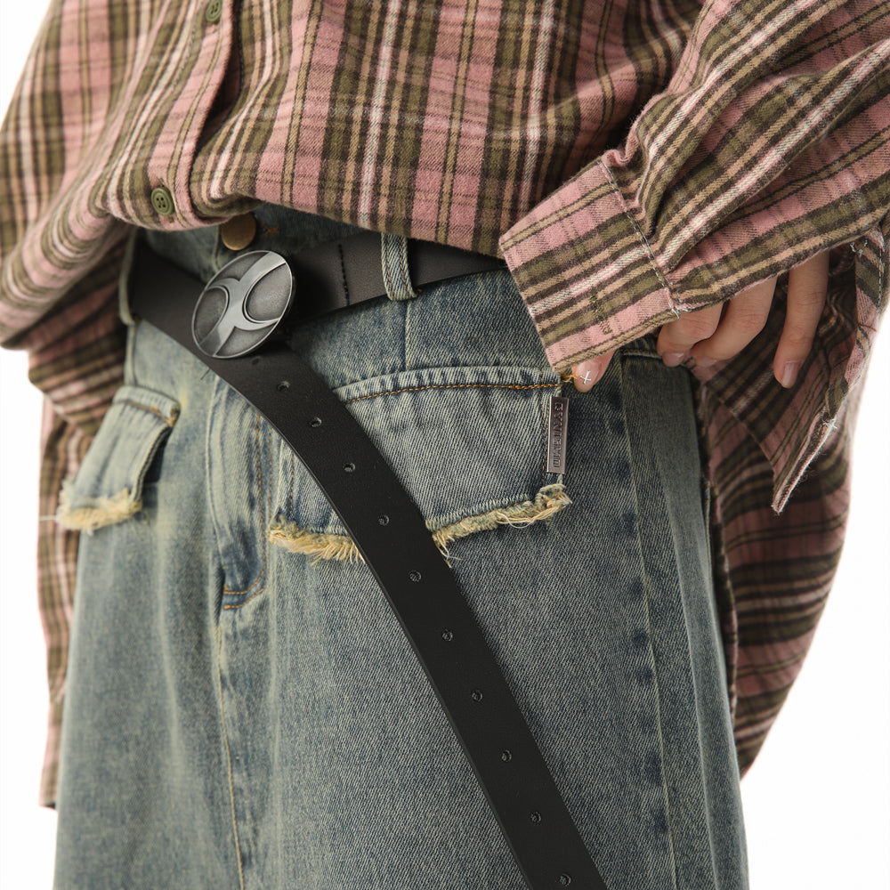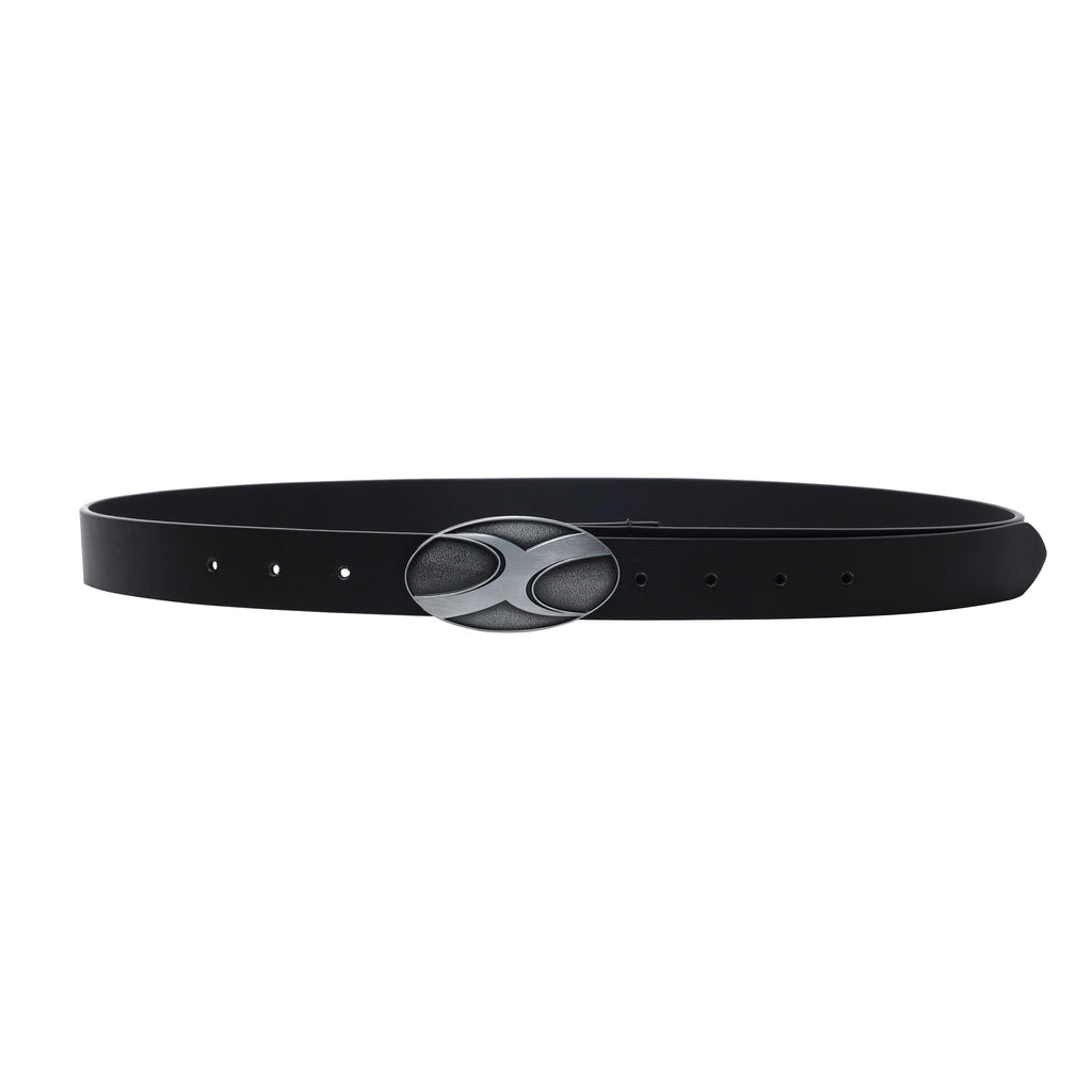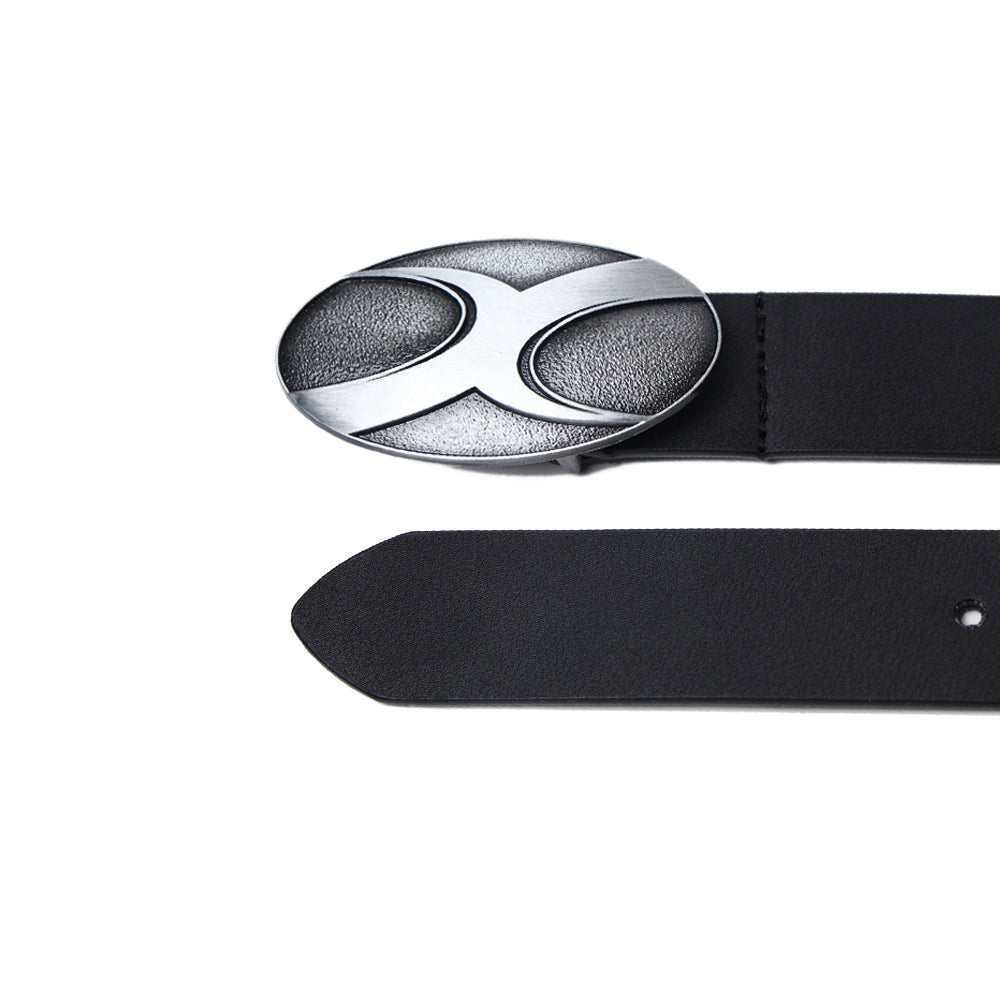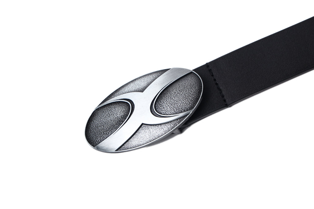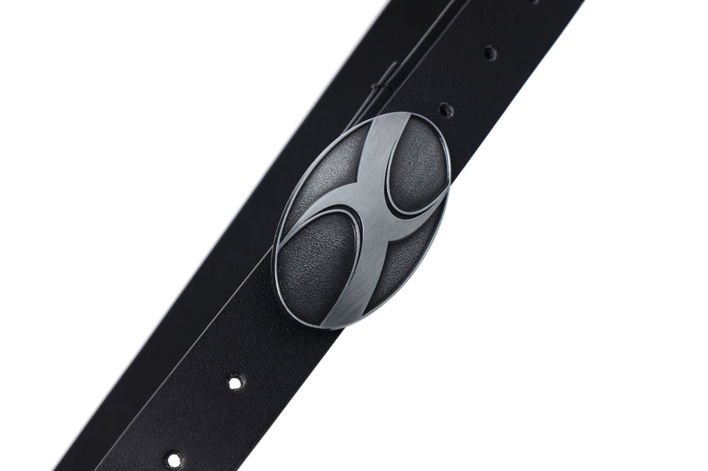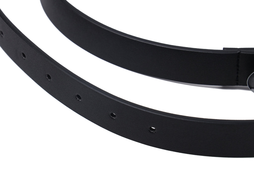 CyNi leather belt in black, paneled construction, logo-engraved adjustable pin-buckle fastening.