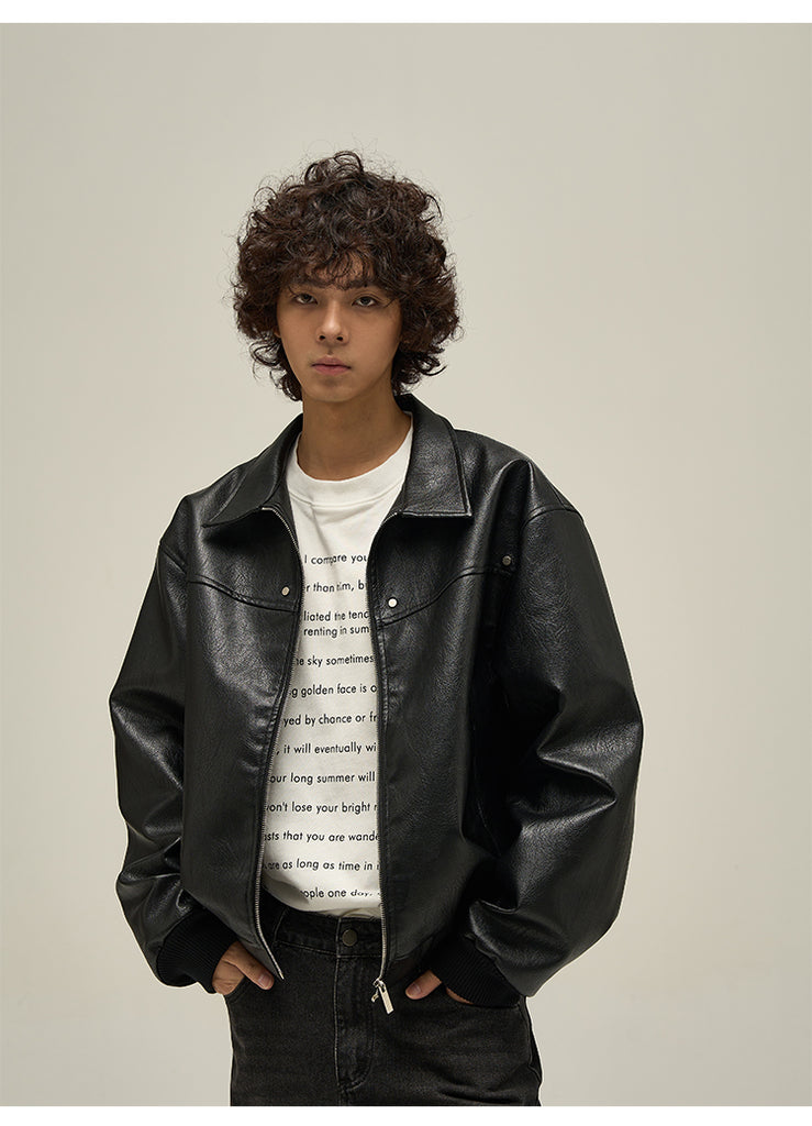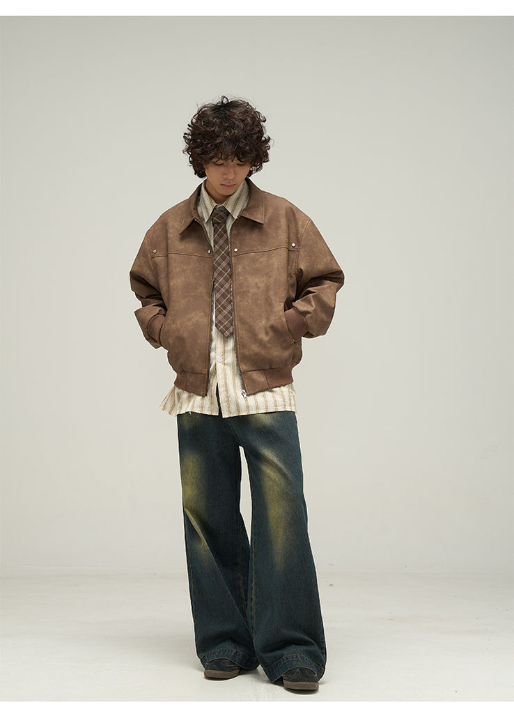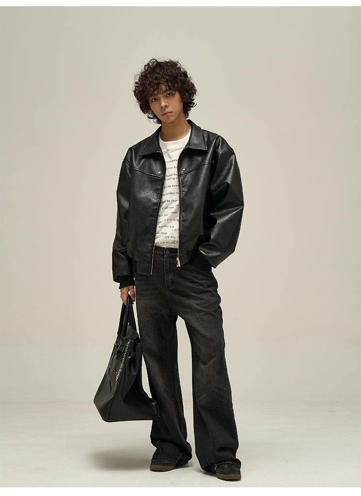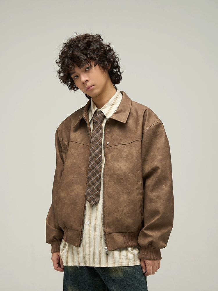 WLNEXT grained faux leather jacket, distressing and fading throughout, paneled construction, rib knit hem and cuffs, spread collar, zip closure, logo hardware at back, silver-tone hardware.