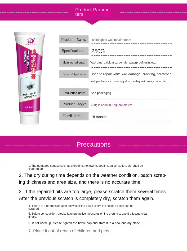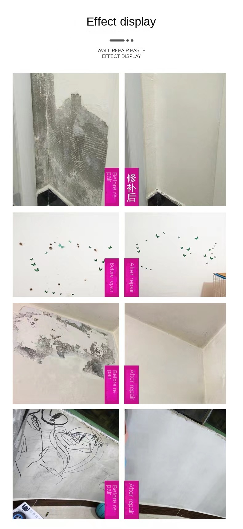 Scope of application: used to repair white wall damage, cracks, scratches, hollowing, peeling, nail holes, cracks and other wall problems