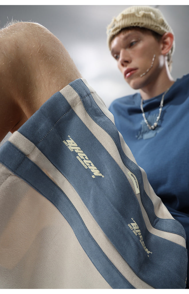 BJHG technical velour wideleg lounge shorts, elasticated waistband with flat adjustable drawstring, parallel suede track stripes, open straight/finished hem bottoms, tonal stitching.