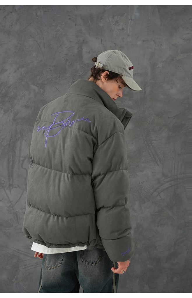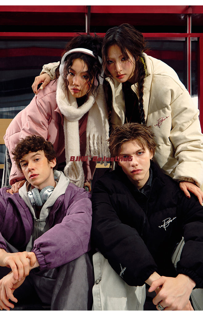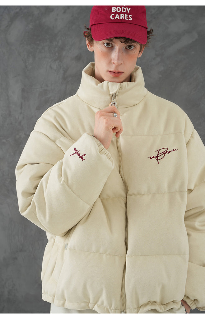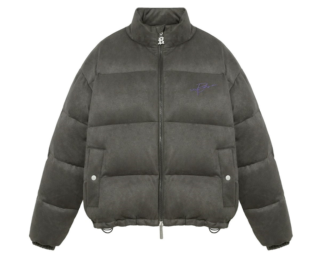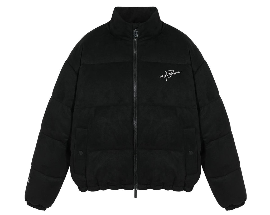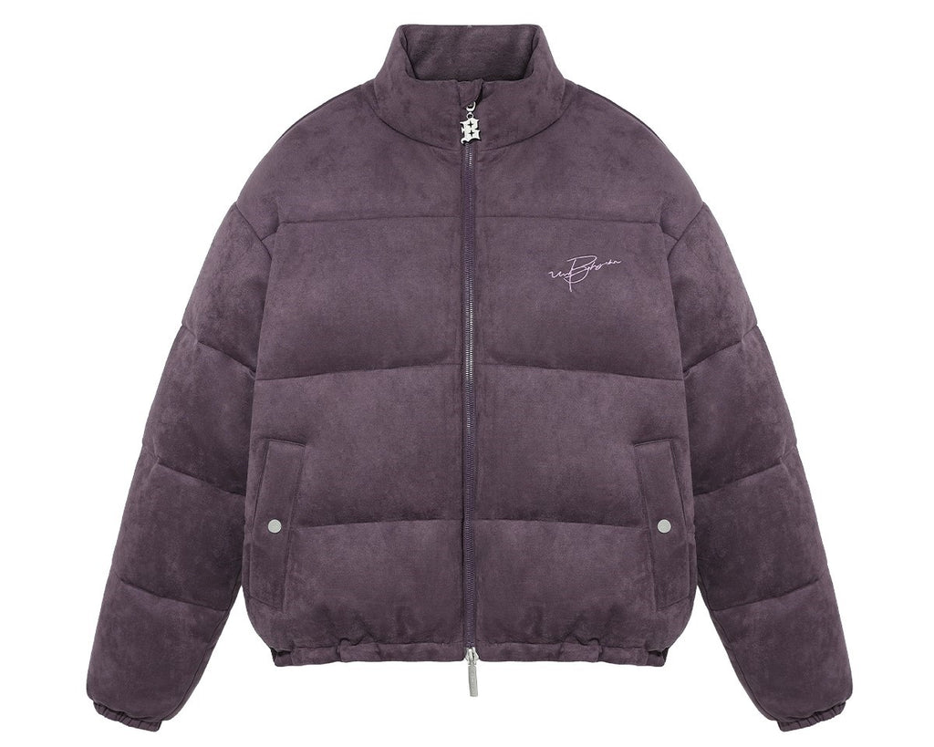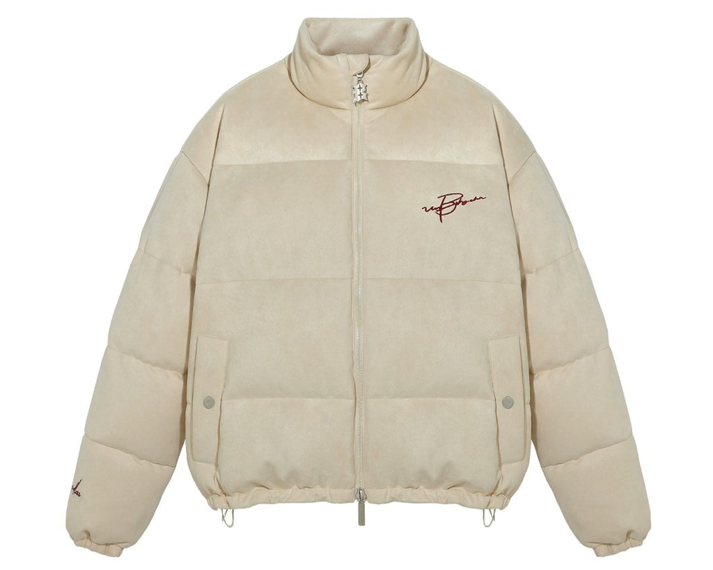 BJHG insulated 360g polyester-blend puffer jacket, two-way zip closure, welt pockets, elasticized hem and cuffs, bungee-style drawstrings at hem, logo embroidered at back.